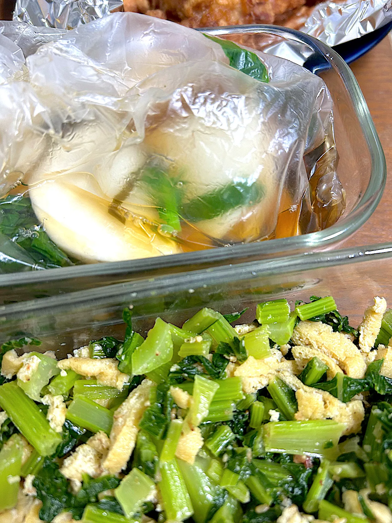カリカリ豚こまの甘酢ごま和え、鰹のたたき、カニカマと...