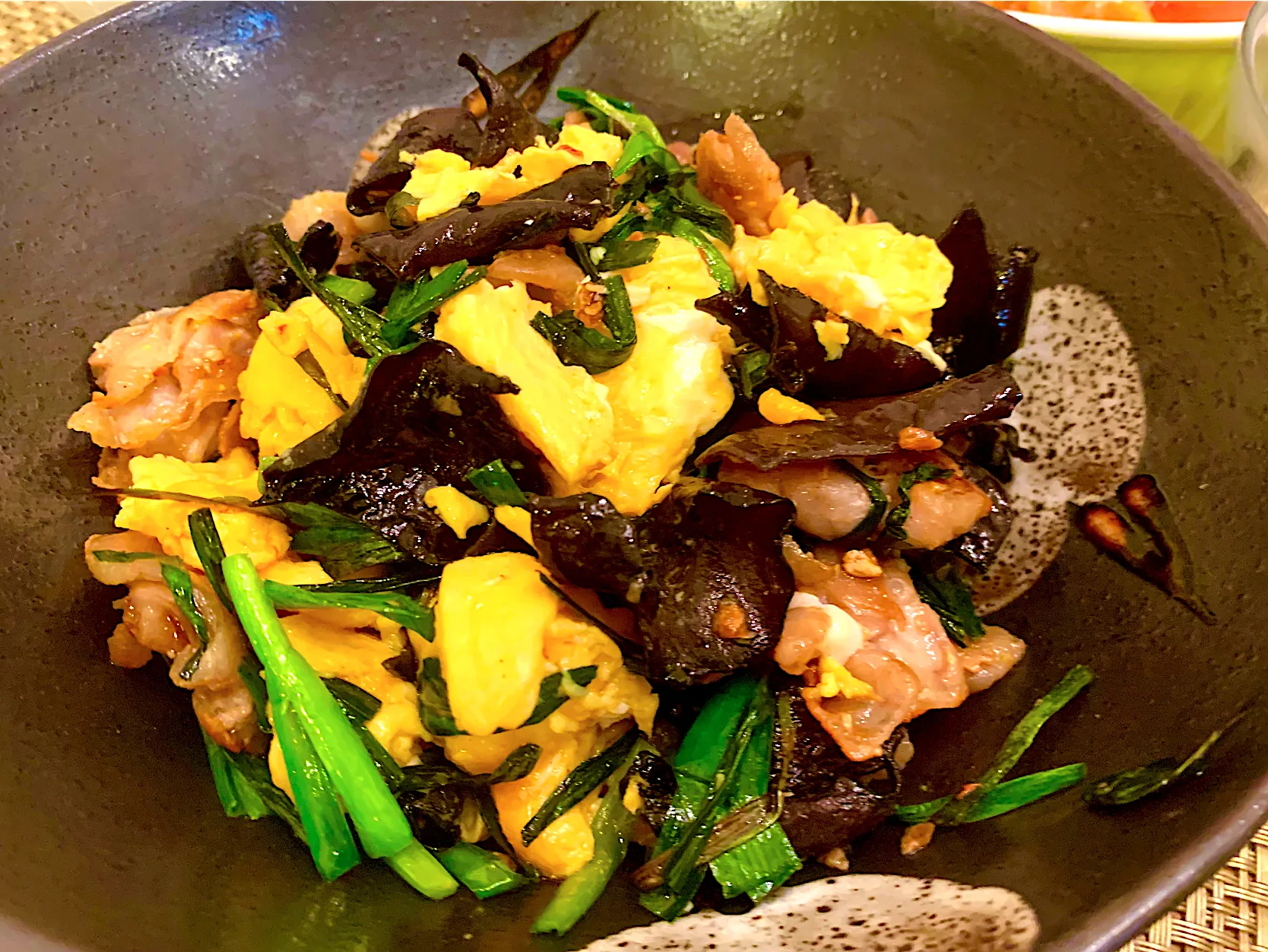 卵は鶏がらスープで味付けしてからまだトロトロな程度に火を通して別皿に取っておき、豚バラ・キクラゲ・ニラを炒めて食べる直前にふんわりと合わせました✨