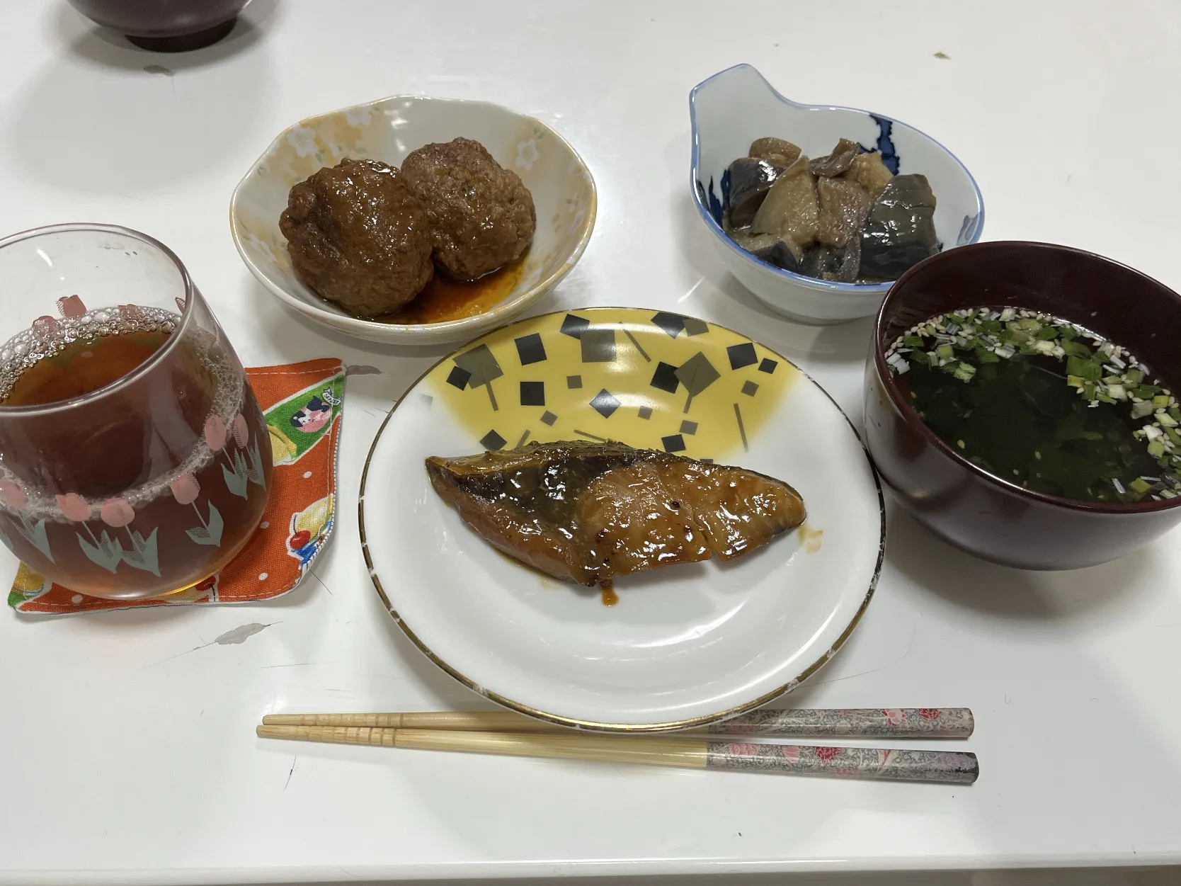 作り置きで晩御飯☆煮込みハンバーグ☆ぶり照り☆揚げなすの煮浸し☆わかめスープ