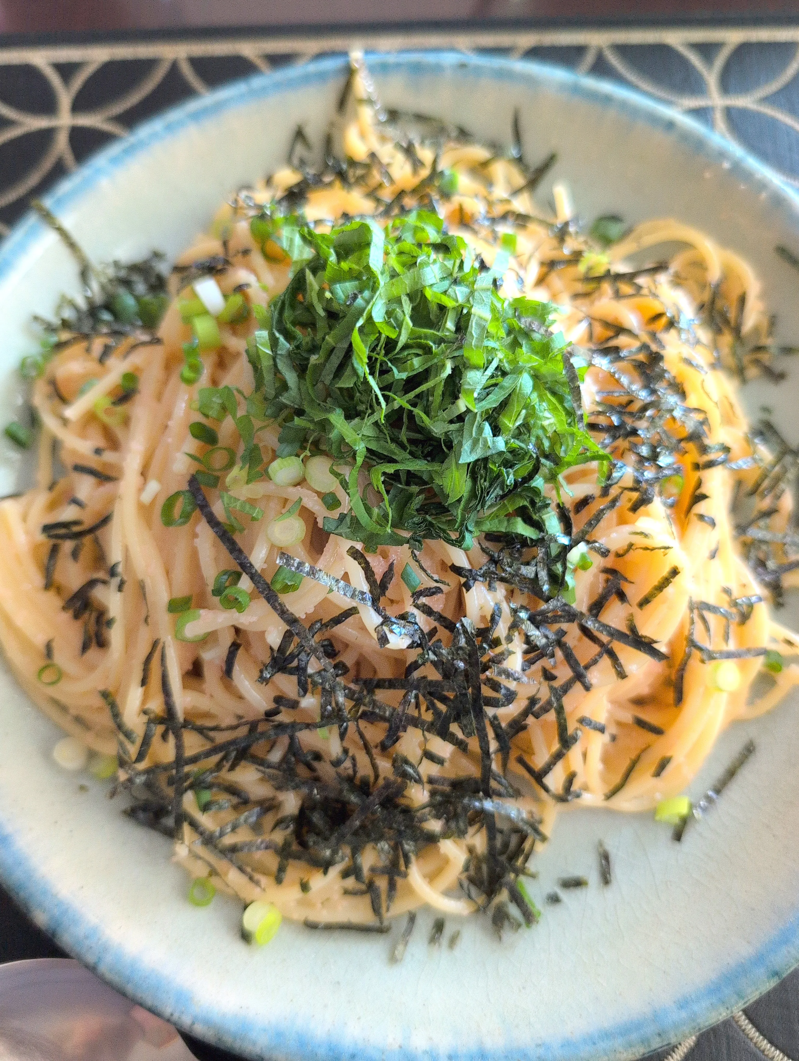 20250729お昼ごはん #スパゲティ #たらこ #たらこスパゲッティ #大葉 #小ねぎ #刻みのり #昆布つゆ