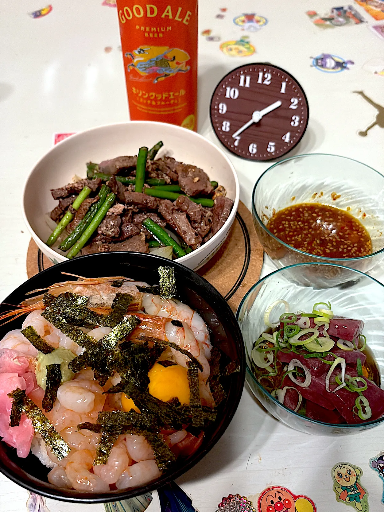 生レバー、海老丼、ハラミとニンニクの芽の炒め後はアルコール|やすさん