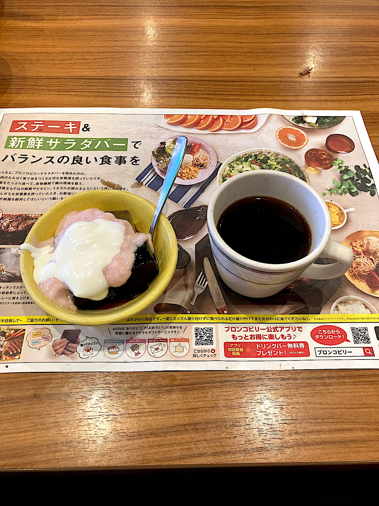 最後にサラダバーからデザートのゼリー&苺クリームとドリンクバーからコーヒーを取ってきました。ご馳走様😋(実況中継終了)
