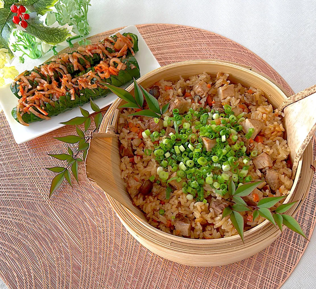 きゅうりの塩麹にキムチもあっさりしながらもパンチがあっておこわにぴったりだなぁ!