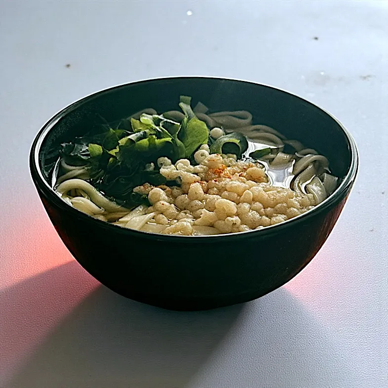 乾燥ワカメ、天カス、一味唐辛子、をトッピング。