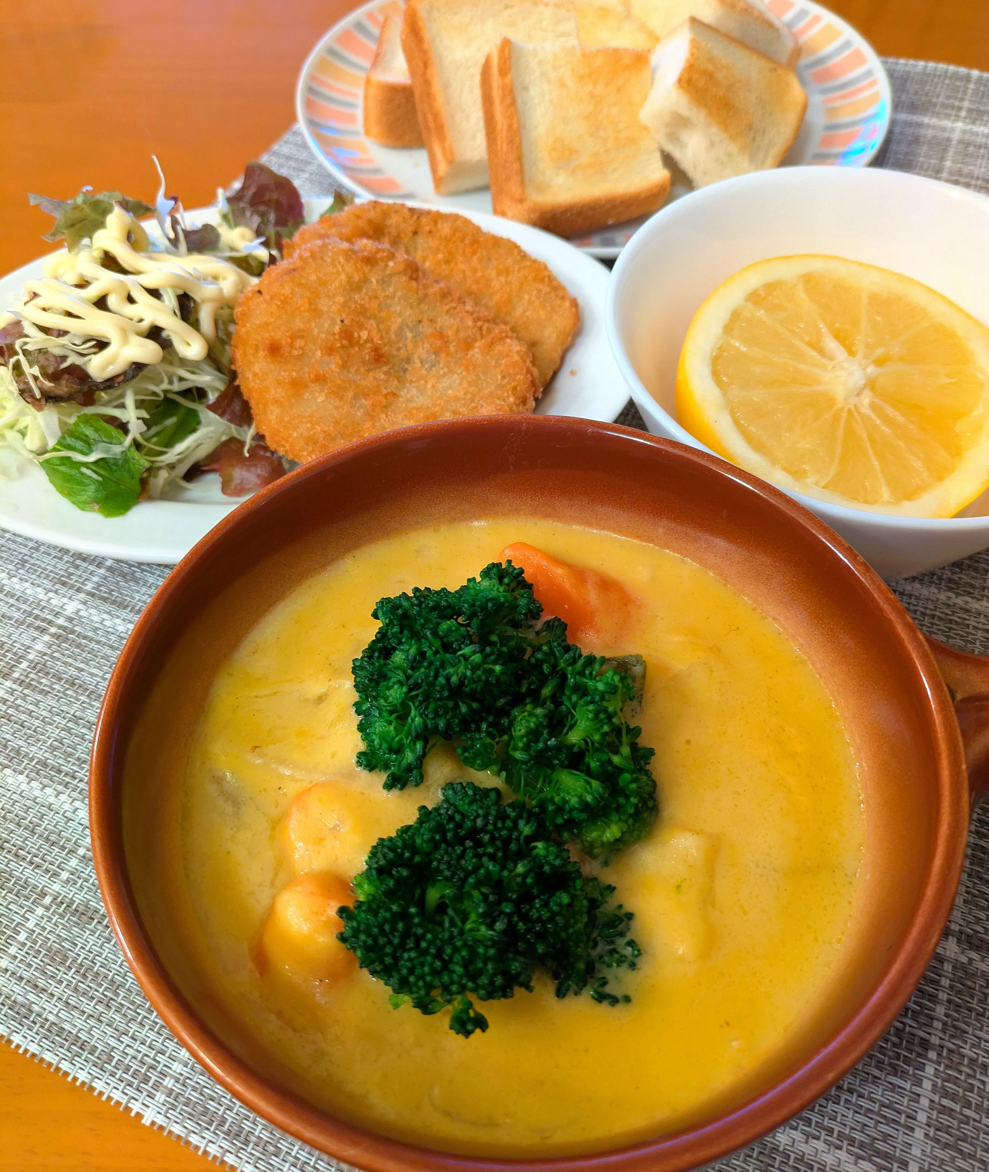 #夕食#シチュー#カレーコロッケ#パン#グレープフルーツ