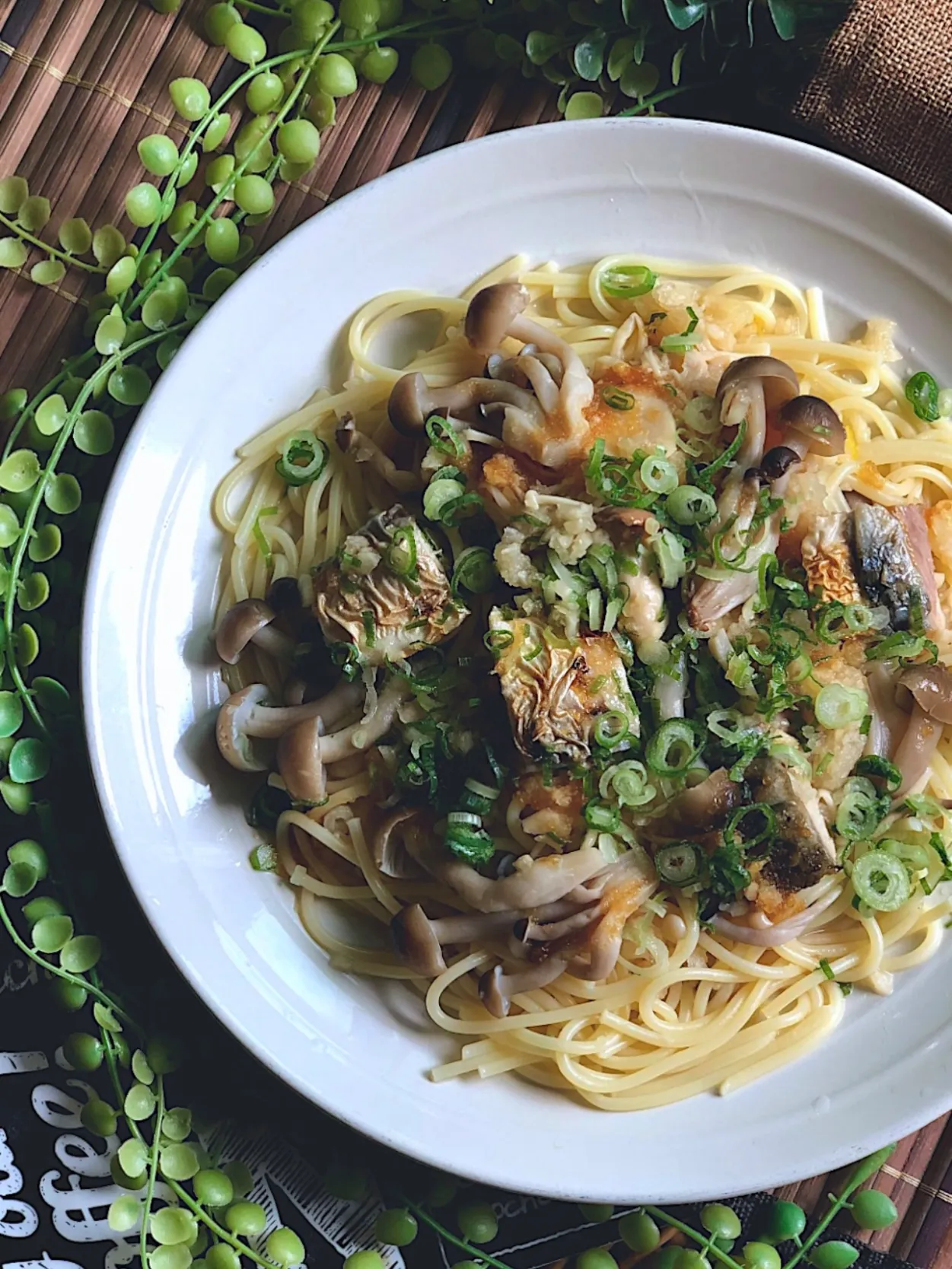 セブンのカップデリさばのおろしポン酢を使ってパスタにしました。(たぶん、今は売ってません)前に作って画像撮りっぱなしだったので放出。