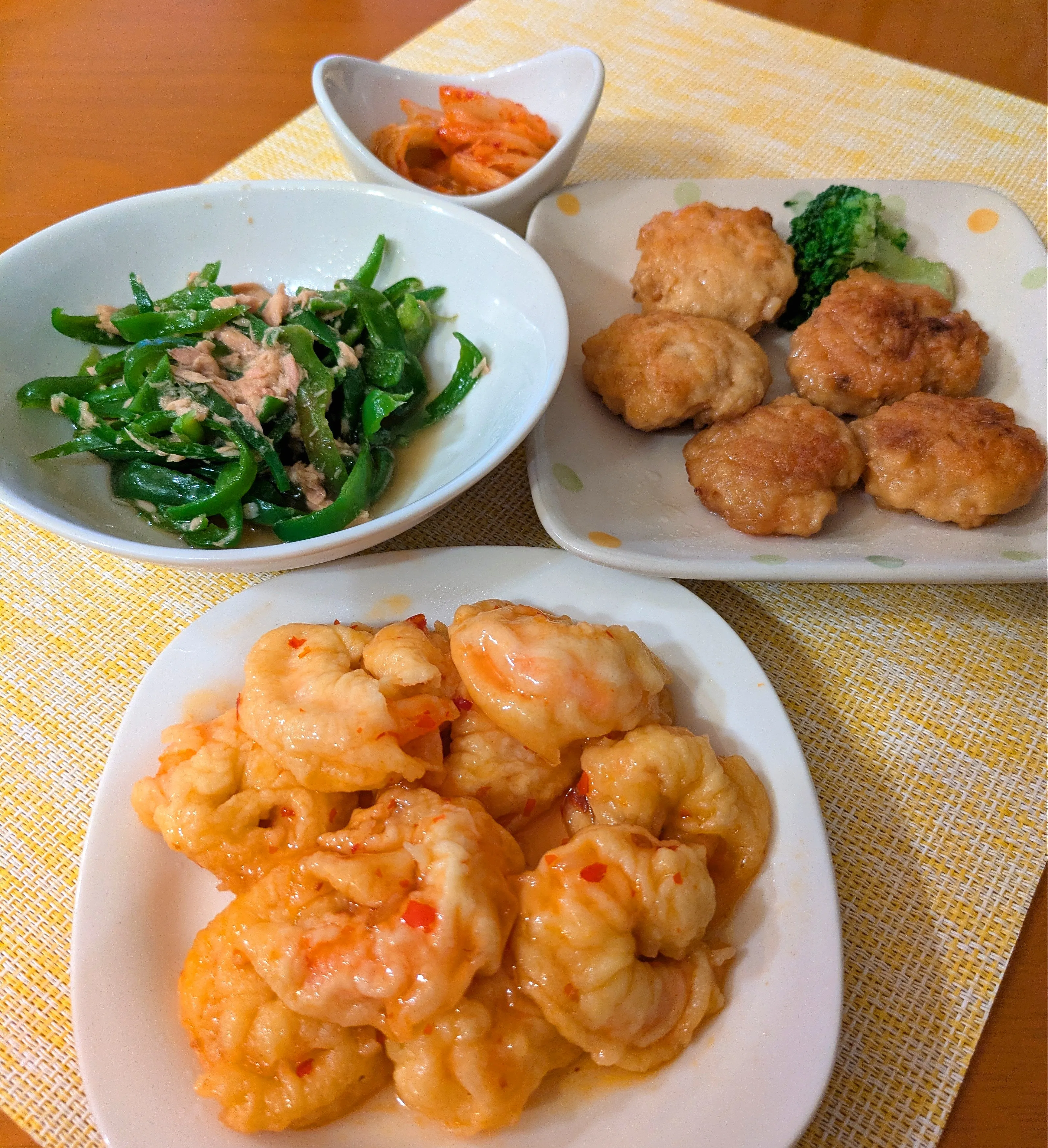 #夕食#エビチリ#つくね#無限ピーマン#キムチ