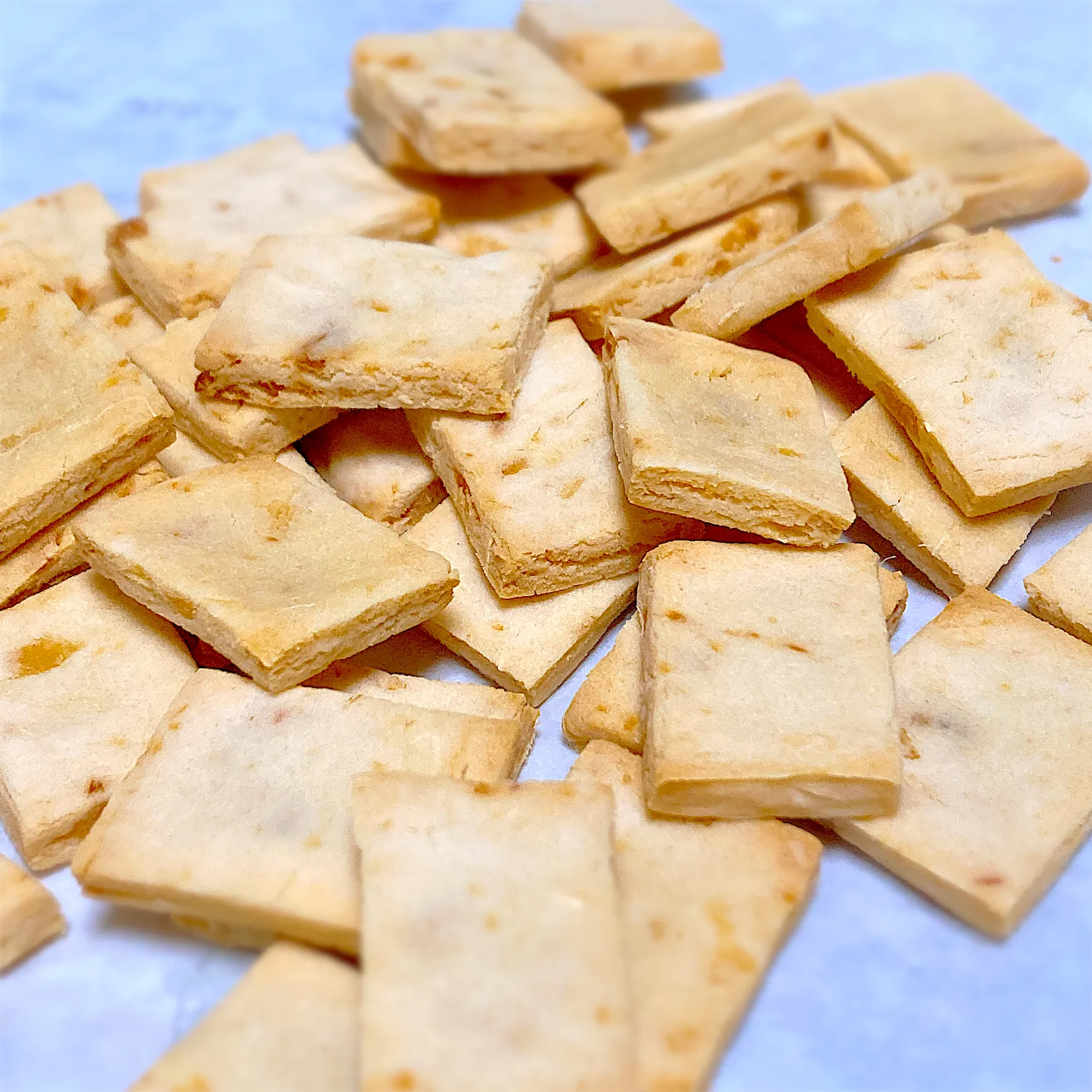混ぜて3mmの厚さに伸ばし適当な大きさ(ウチの子は10kgの柴なので、2×3cm位)に切って170℃で20分程焼いた。