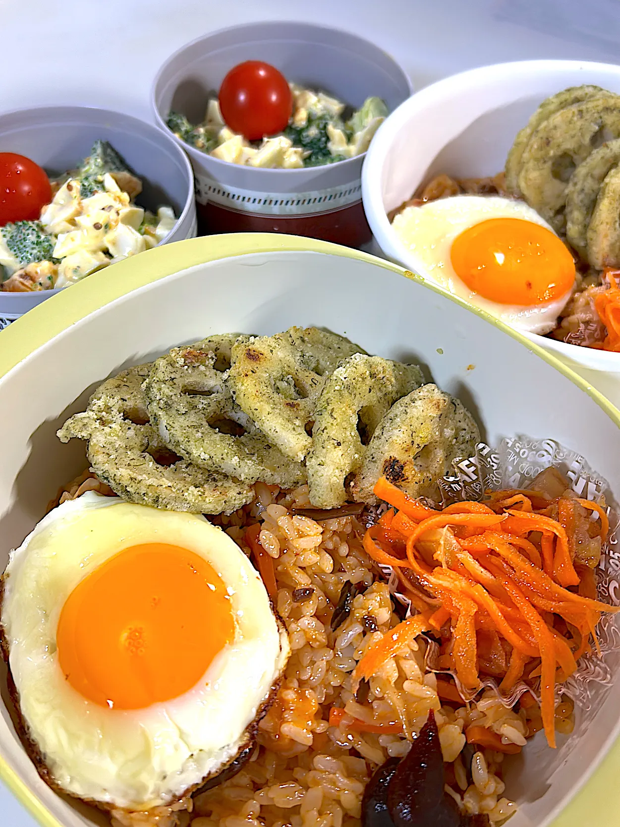 ビビンバ丼 目玉焼き🍳人参デーツラペ🥕レンコン青のり焼き ブロッコリー玉子マスタードサラダ ミニトマト🍅