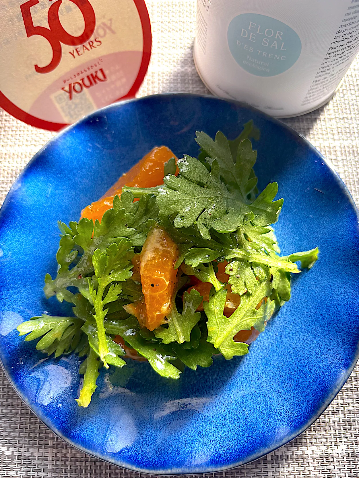 みかんの甘酸っぱさと春菊の苦味が爽やかなサラダ。