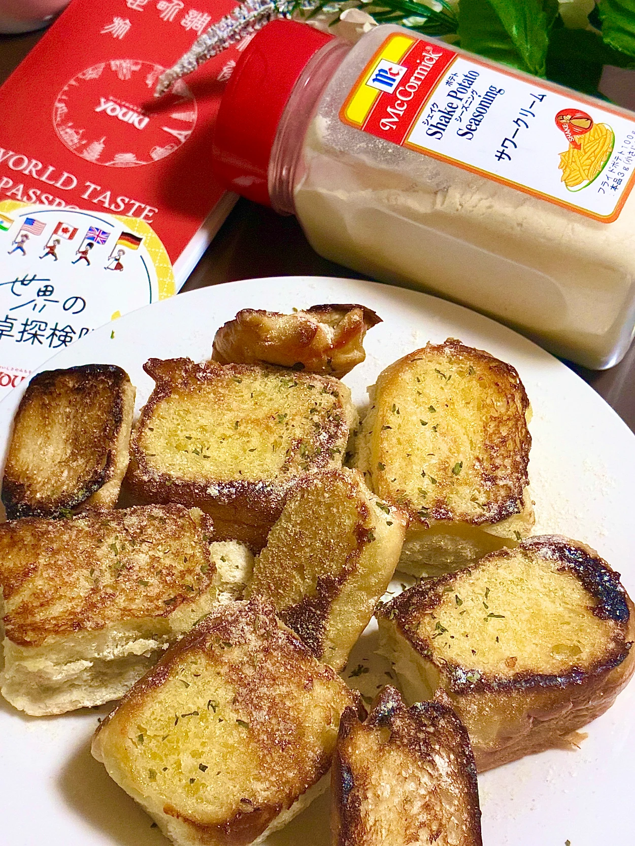 オリーブオイルとおろしニンニクをフライパンで熱して、パンを入れて軽く焼き目をつけ、お皿に持ってサワークリームのシーズニングをかければできあがり!