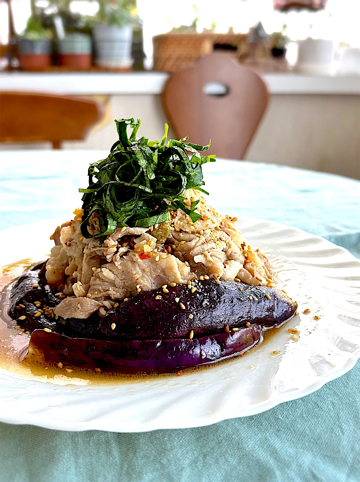なすの上に味付けしてほぐした豚バラ肉を乗せて、タレも全部かけて