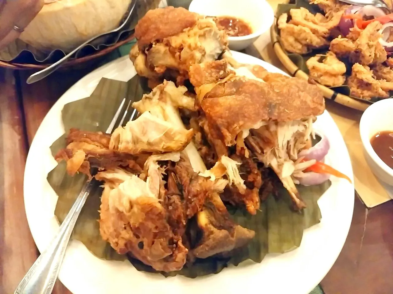 フィリピン、セブ島に行った時のフィリピン家庭料理です。豚肉を丸ごと揚げた物をスイートチリソースなどをつけて頂きました😄