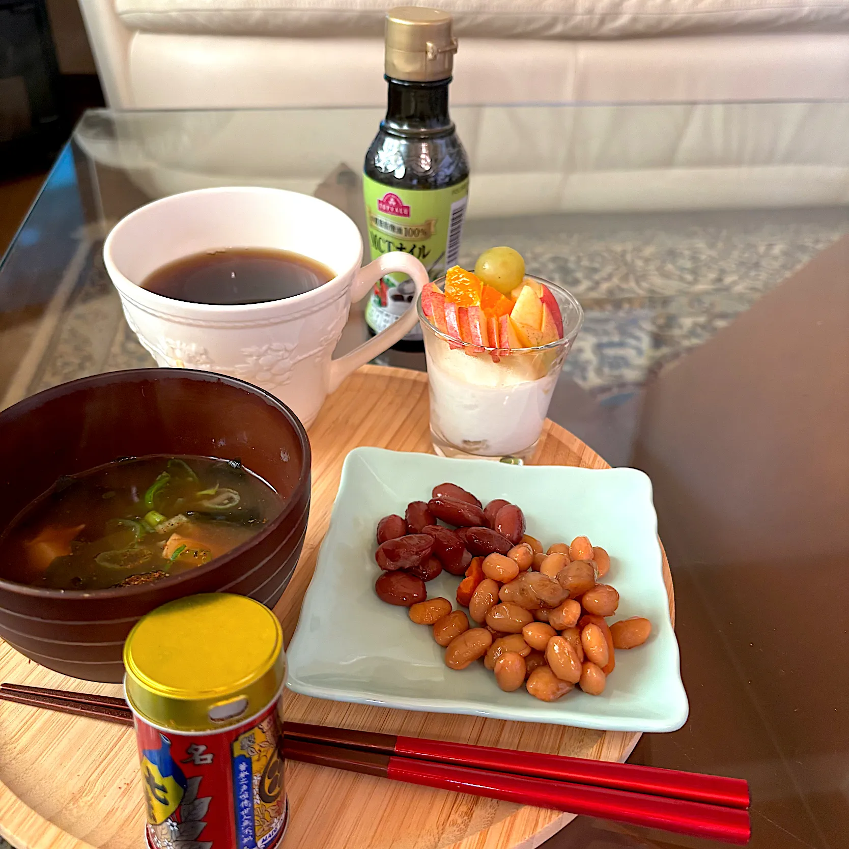 トーストサンドイッチ、煮豆、かつやの大根漬け、カステ...