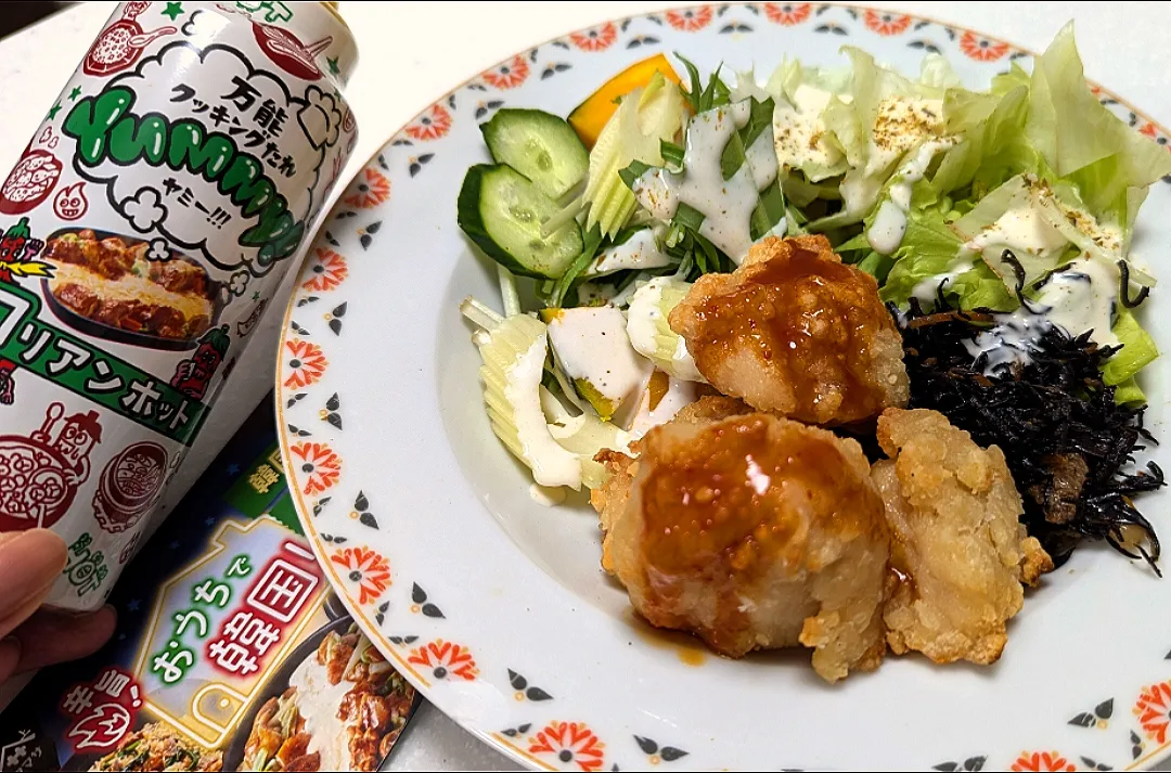 ヤンニョムチキンずっと食べてみたかったのでどんなかなぁと思いつつ、ソース味見したところ結構しっかりしょっぱ辛かったので(唐揚げに下味しっかりつけてしまってた💦)今回はソースとして遠慮しがちにかけて頂きました。