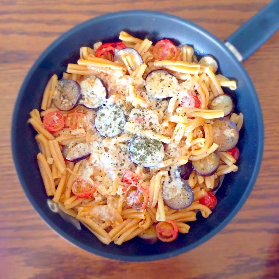 いちいちパスタを茹でるのがめんどうなので、フライパンで1発パスタがうちの定番です。