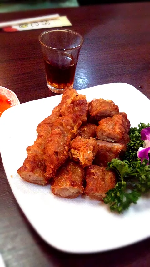 湯葉揚げ、切り干し大根たまご、ネギ焼きなどいろいろ、老酒付き。