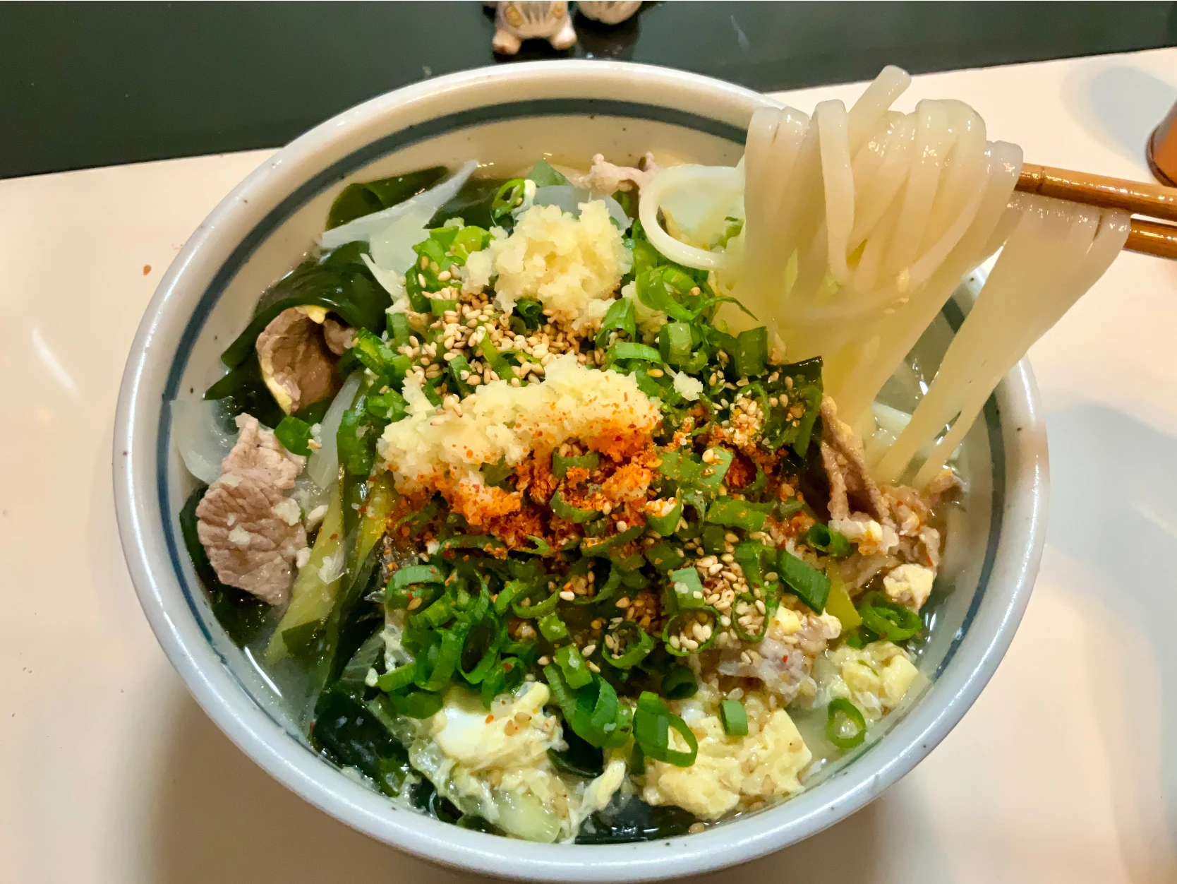 肉🍖玉🥚玉🧅ワカメうどん うどんは讃岐の石丸うどんの乾麺で。