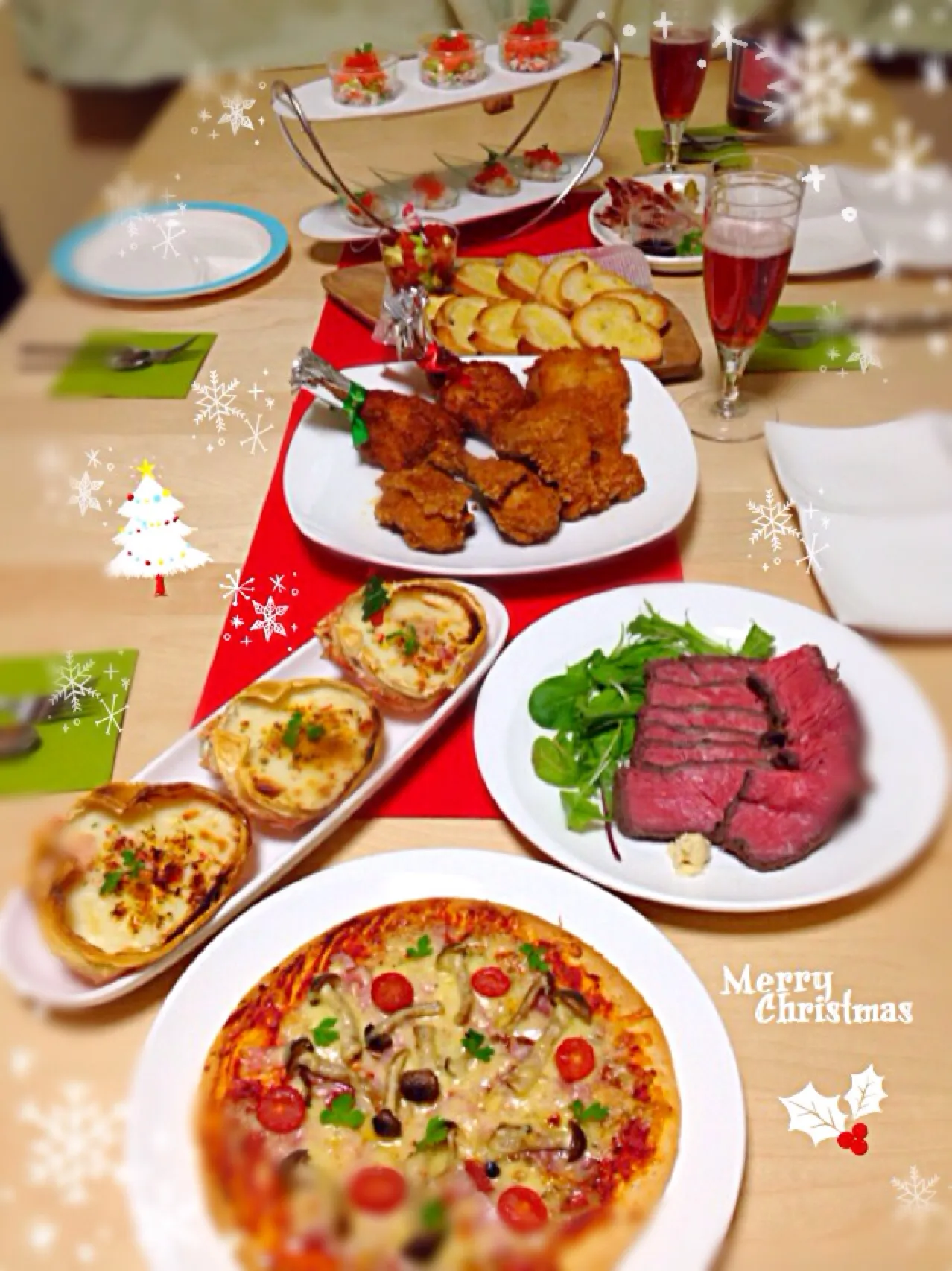 ピザ カニ甲羅グラタン フライドチキン ローストビーフ ブルスケッタ サーモン、カニ、アボカド、イクラのサラダ仕立て ガス海老お刺身イクラ乗せ でした!