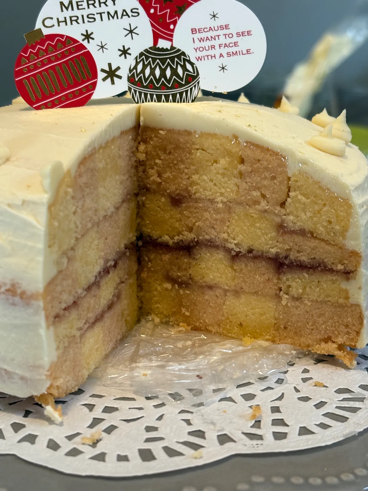 一つの生地を2つに分けて1つの生地にラズベリーを加えてピンクに。3つのセルクルで抜いて交互にはめ込み重ねて市松模様を作る断面が芸術的なケーキ‼️もちろん食べても芸術的なお味‼️ #チョコレート