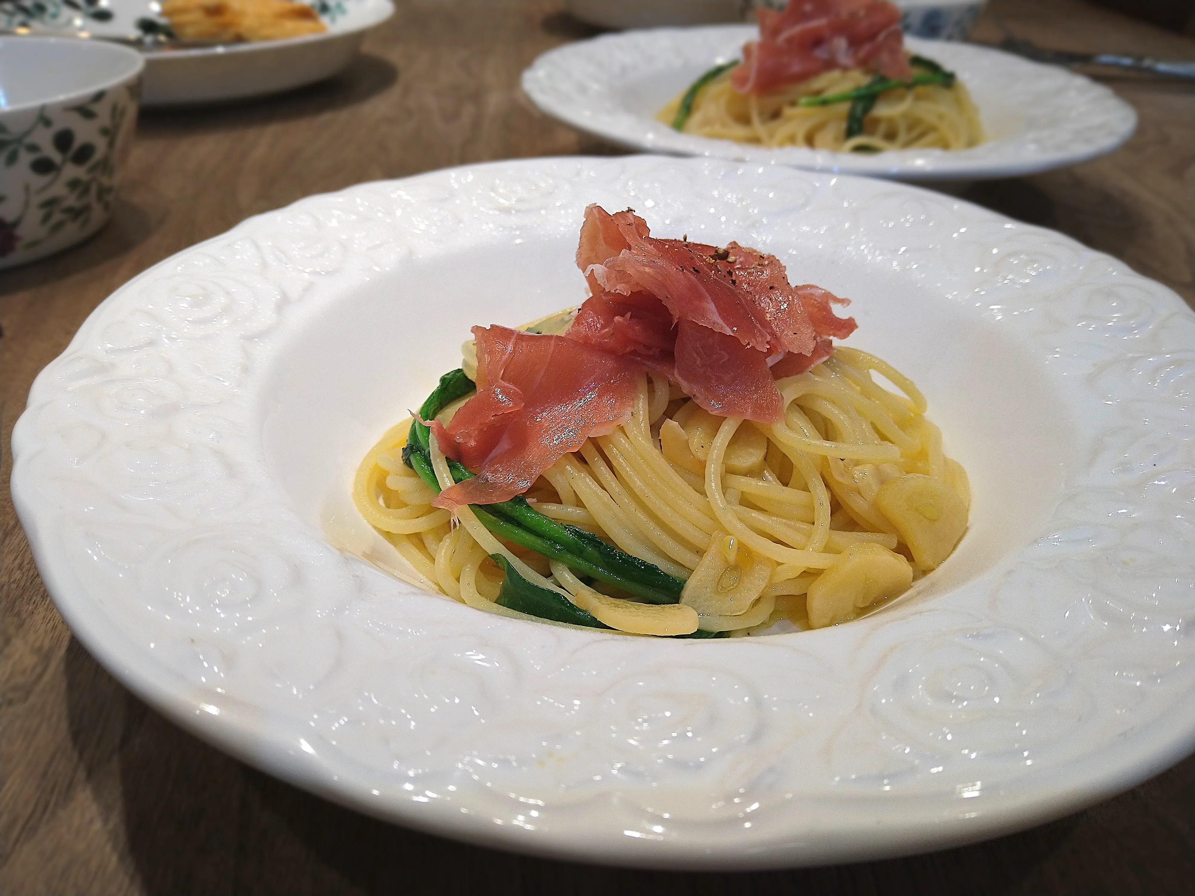 #パスタ#スパゲティ#オイルソース #ペペロンチーノ#ハム/ソーセージ/ベーコン #生ハム#野菜料理 #ルッコラ#にんにく