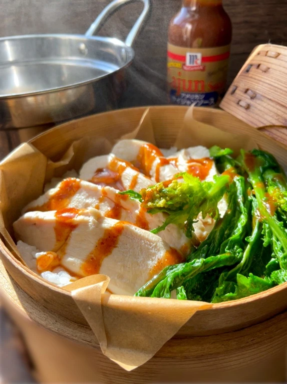 #snapdish #ユウキ食品 #おいしい世界ごはんパートナー #世界調味料パスポート #アメリカンケイジャンソース #ケイジャンソース #蒸籠蒸し #せいろ蒸し #菜の花 #塩糀パウダー