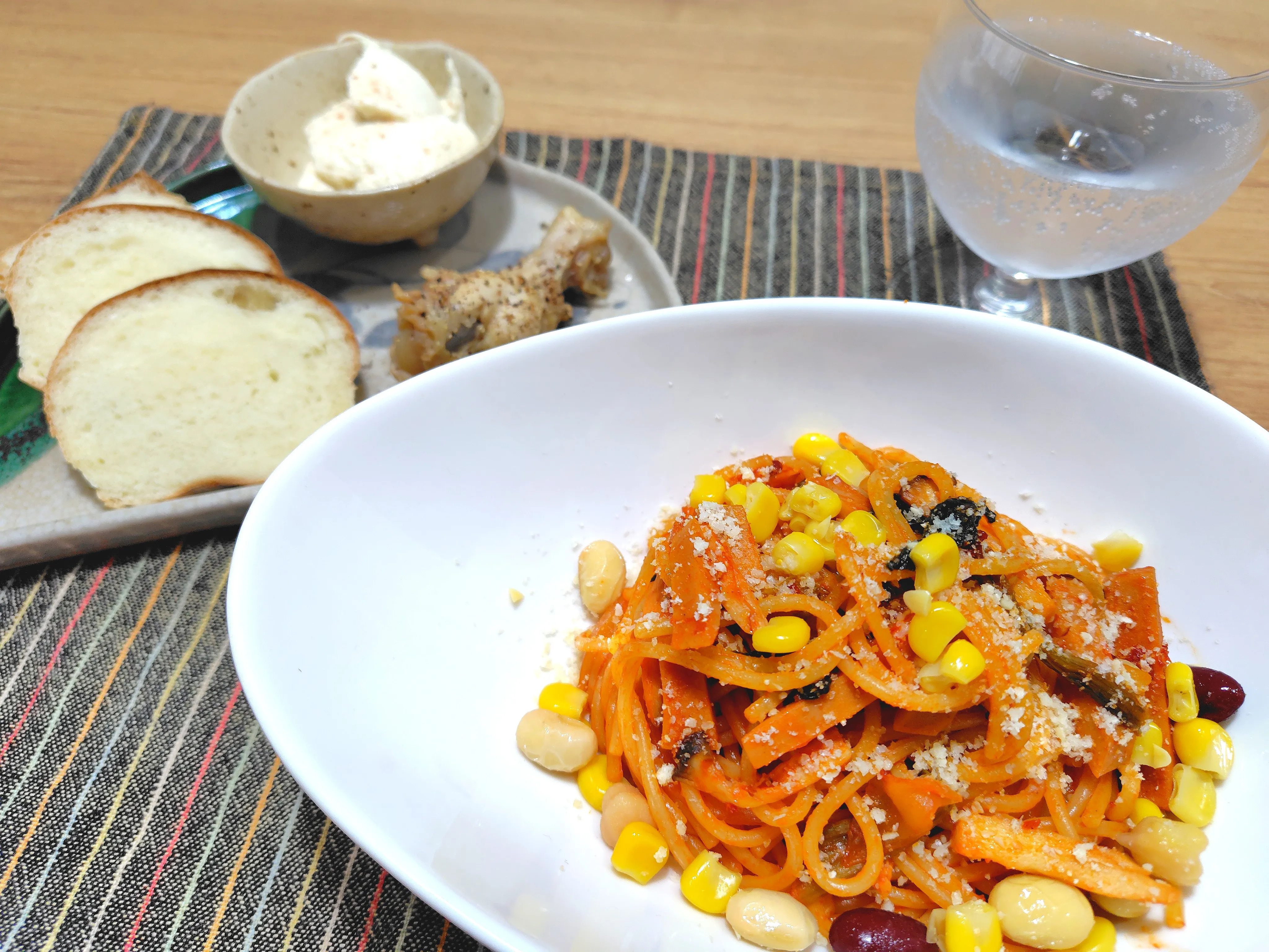 ナポリタンとペッパー手羽元、米粉パンで晩酌|おかめんさん