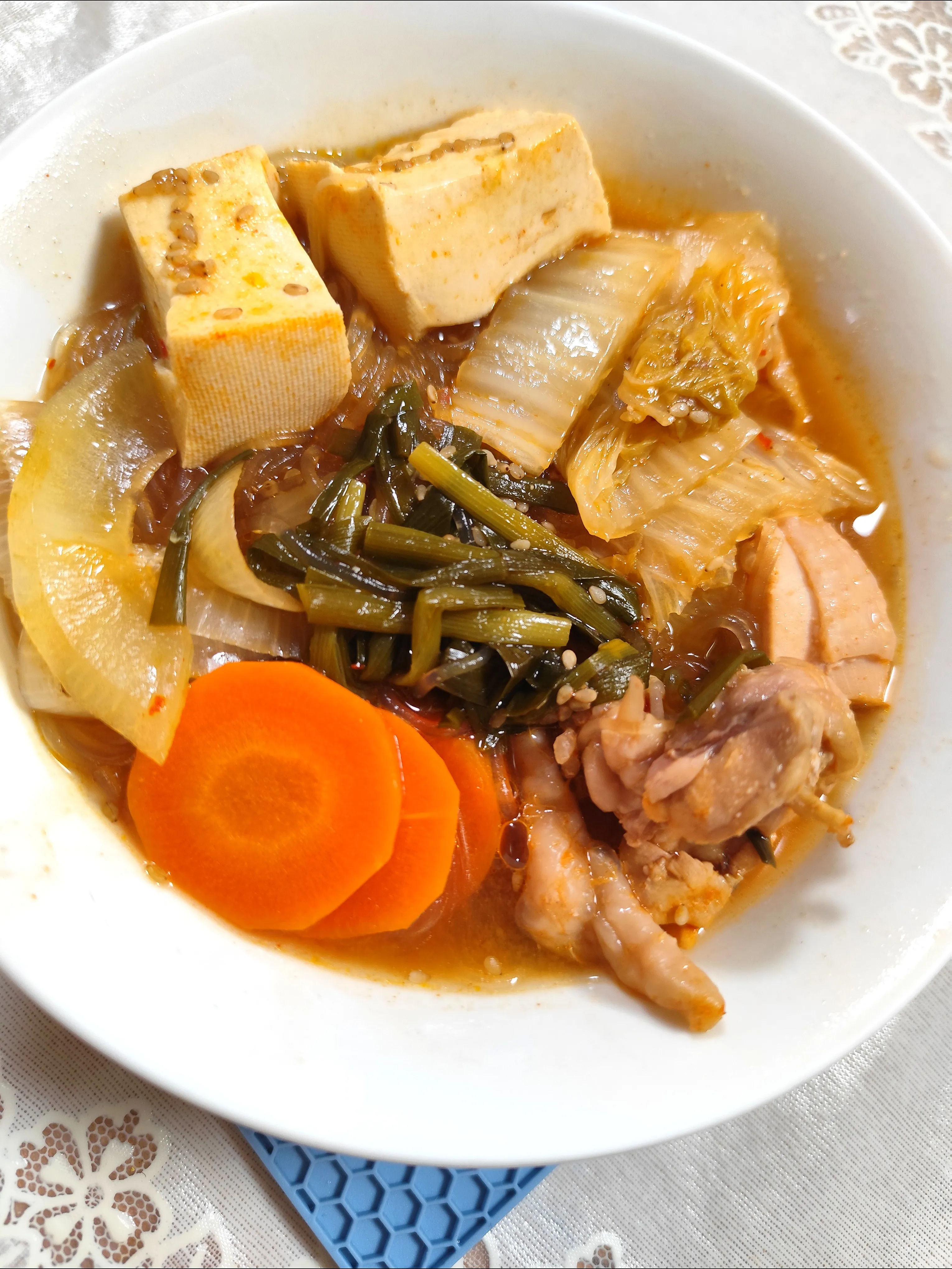 具材は鶏もも肉、木綿豆腐、玉ねぎ、人参、ニラ、白菜、椎茸冷凍していたもの、春雨、胡麻、マルコメさんの液みそ料亭の味、酒少し、味醂、糀甘酒小パック半分、キムチ鍋のもと半瓶くらい、水、少し胡麻油。我が家には辛み強めだけど美味しかったです😊2人は納豆も。