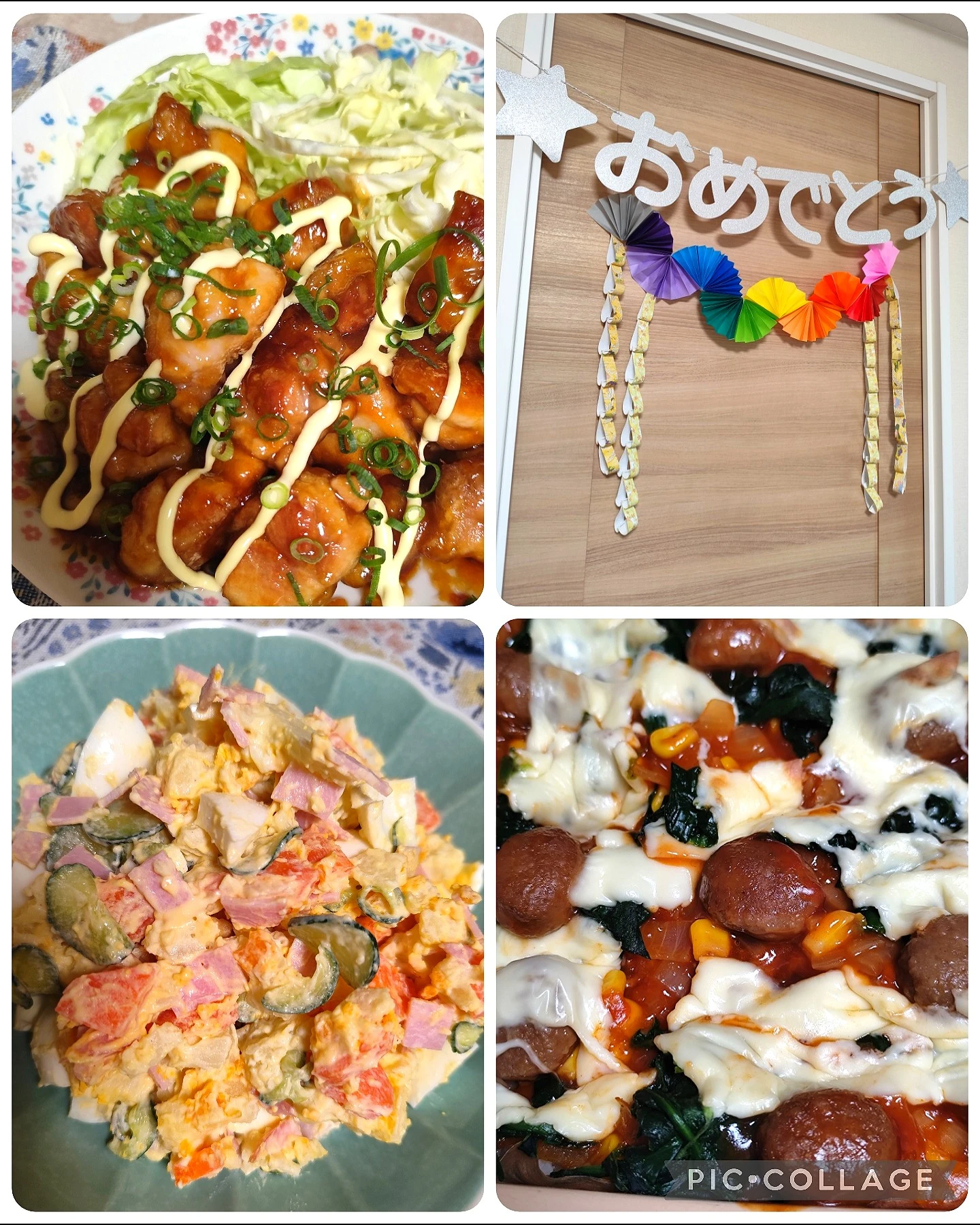 我が家のノーマルポテトサラダ、昔に作ったミートボール、ミートソースを使ったドリア(具材は変えています)。飾りは毎年折り紙飾りを作ります😊おめでとうはセリアの。
