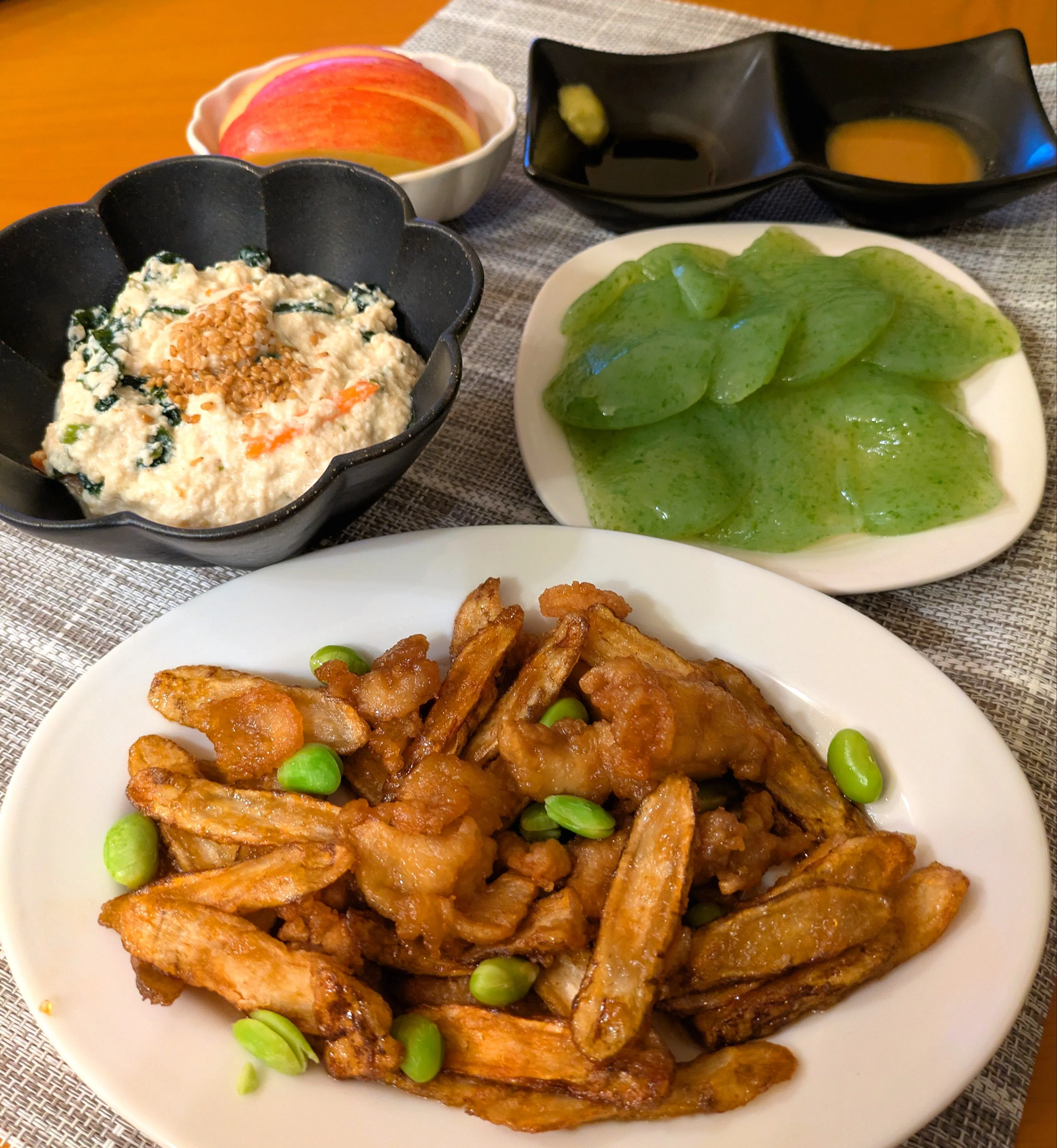 #夕食#チキンチキンゴボウ#刺身こんにゃく#白和え#青森りんご