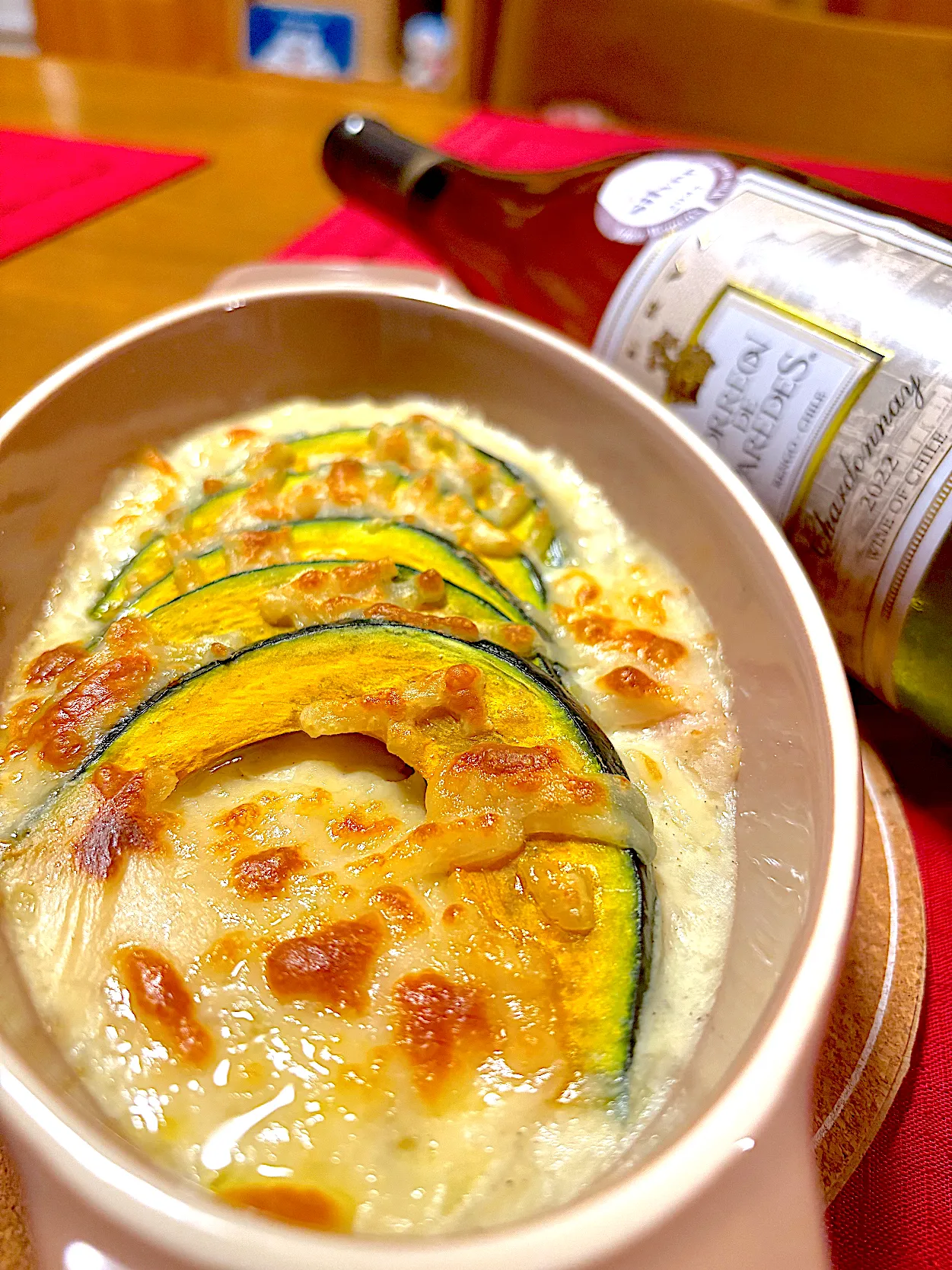 めっちゃなめらかそうなホワイトソースにこのかぼちゃの大きめ薄切りカットがグッとくる(੭ु ›ω‹ )੭ु