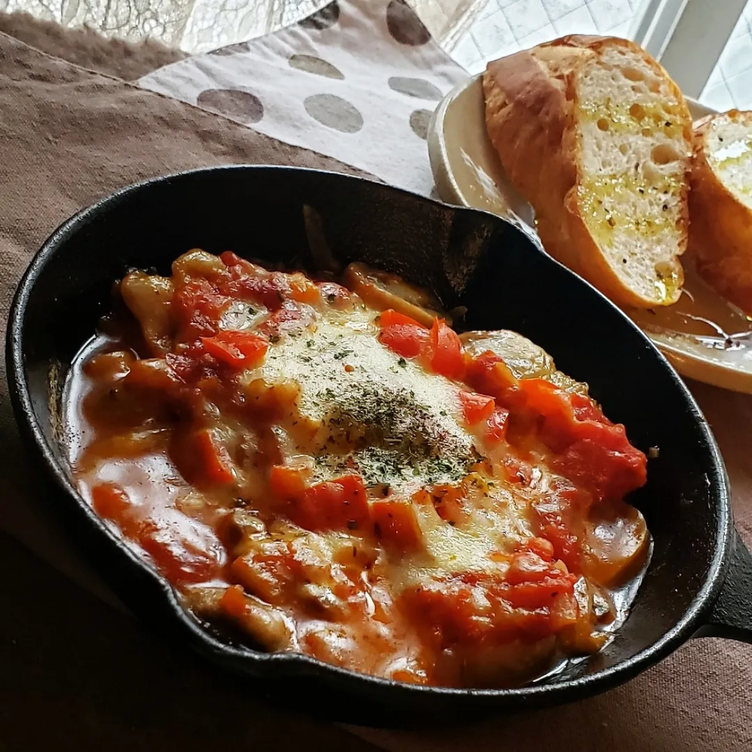 スキレットにオリーブオイル、鶏もも肉を皮目を下にして並べハーブソルト少々、皮目がカリッとしたら逆さむけ、新玉葱、マッシュルームで隙間をうめる、自家製トマトソースをまわしかけ、パプリカ粉&レッドペッパーをふり、たっぷりのシュレッドチーズ、赤パプリカをのせ、蓋をして蒸し焼き、焼き上がったらパセリ粉をふって完成。バゲットを添えて。