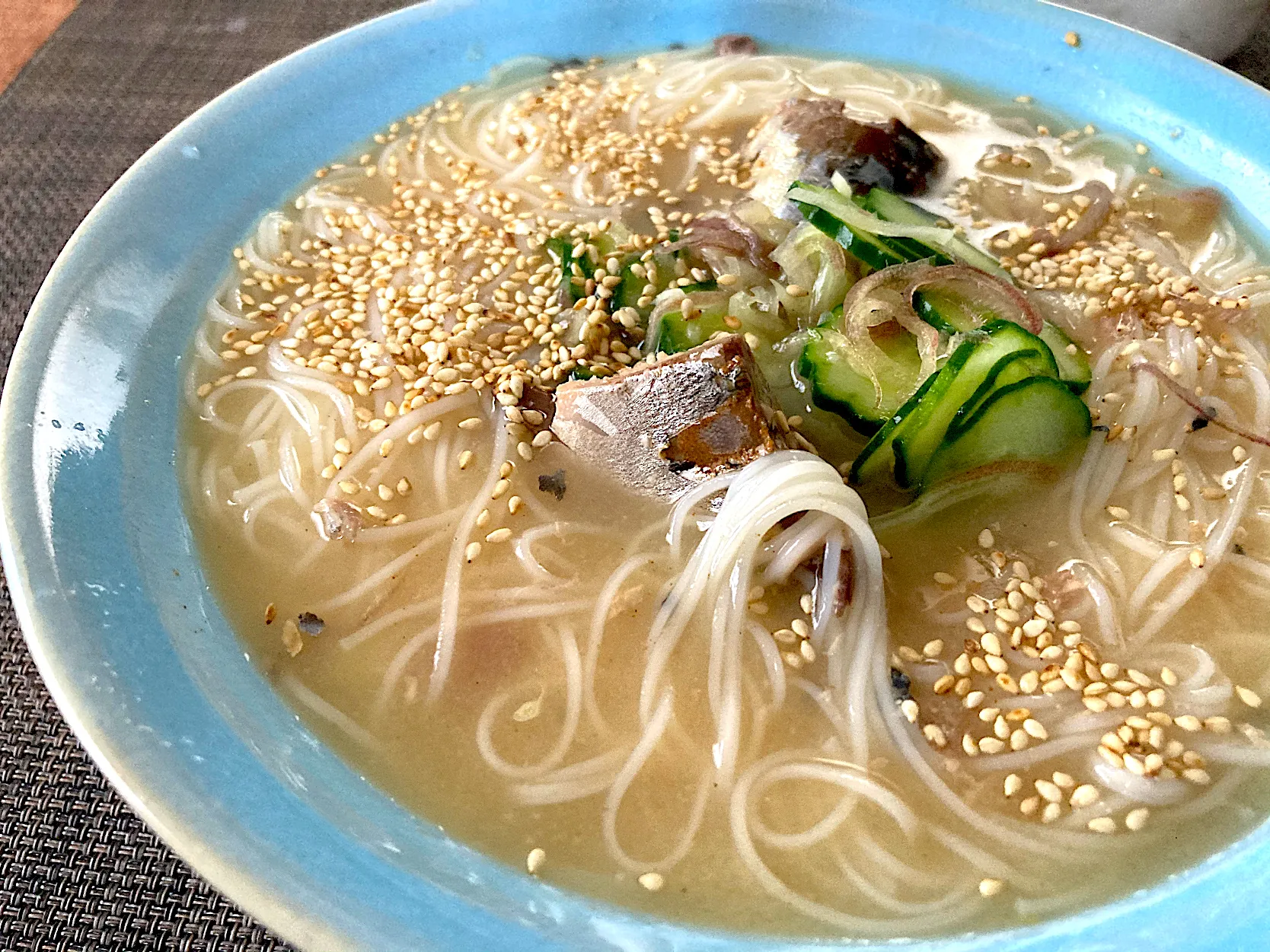 ランチは涼を求めて冷たいものを…と、サバの水煮缶でなんちゃって冷や汁を作り、おそうめんを頂きました。