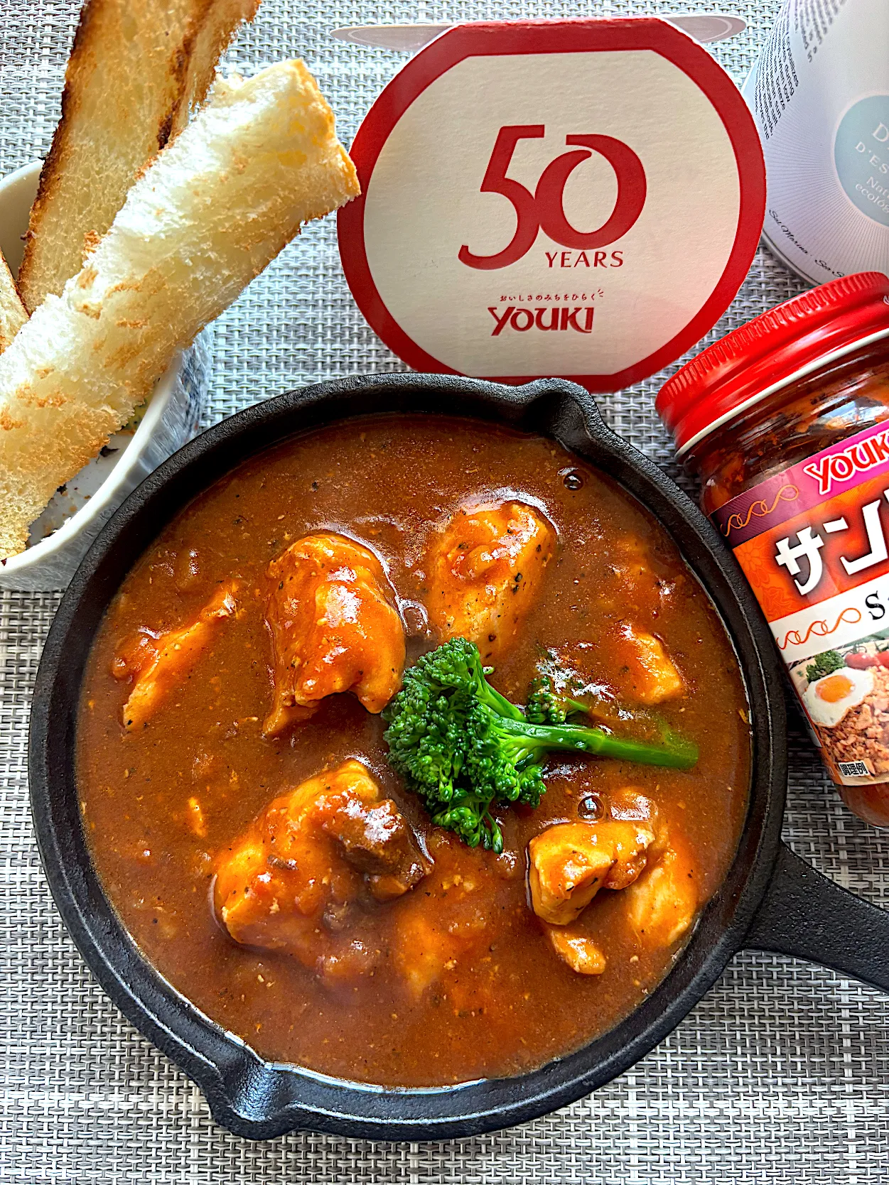 デミグラスソースにサンバルの辛味とガラムマサラでスパイシーにした鶏もも肉の煮込み。