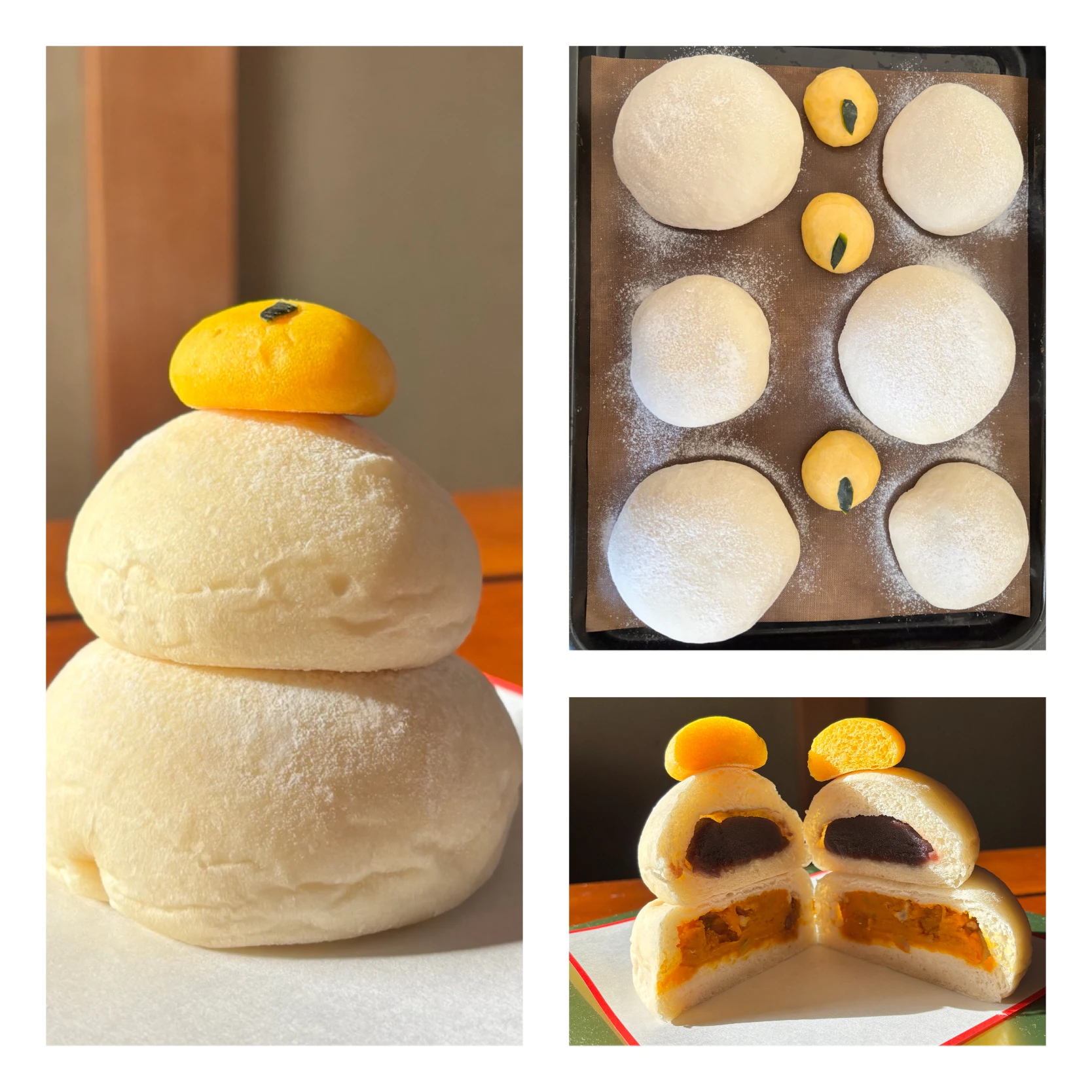 *鏡餅パン ⚫︎みかん(かぼちゃ生地パン) ⚪︎上の餅(こしあん) ◯下の餅(かぼちゃレーズンくるみ)