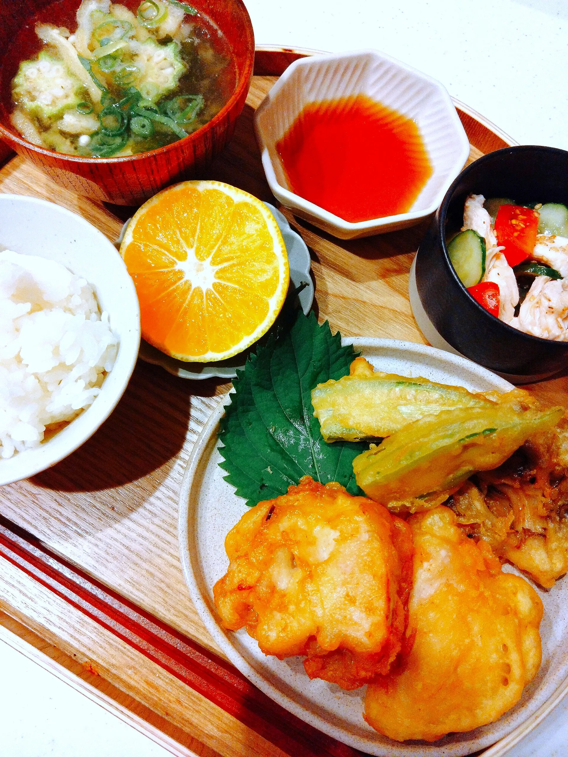 鶏とオクラと舞茸の天ぷら、ササミときゅうりの胡麻マヨサラダ、お味噌汁、早生みかん🍊
