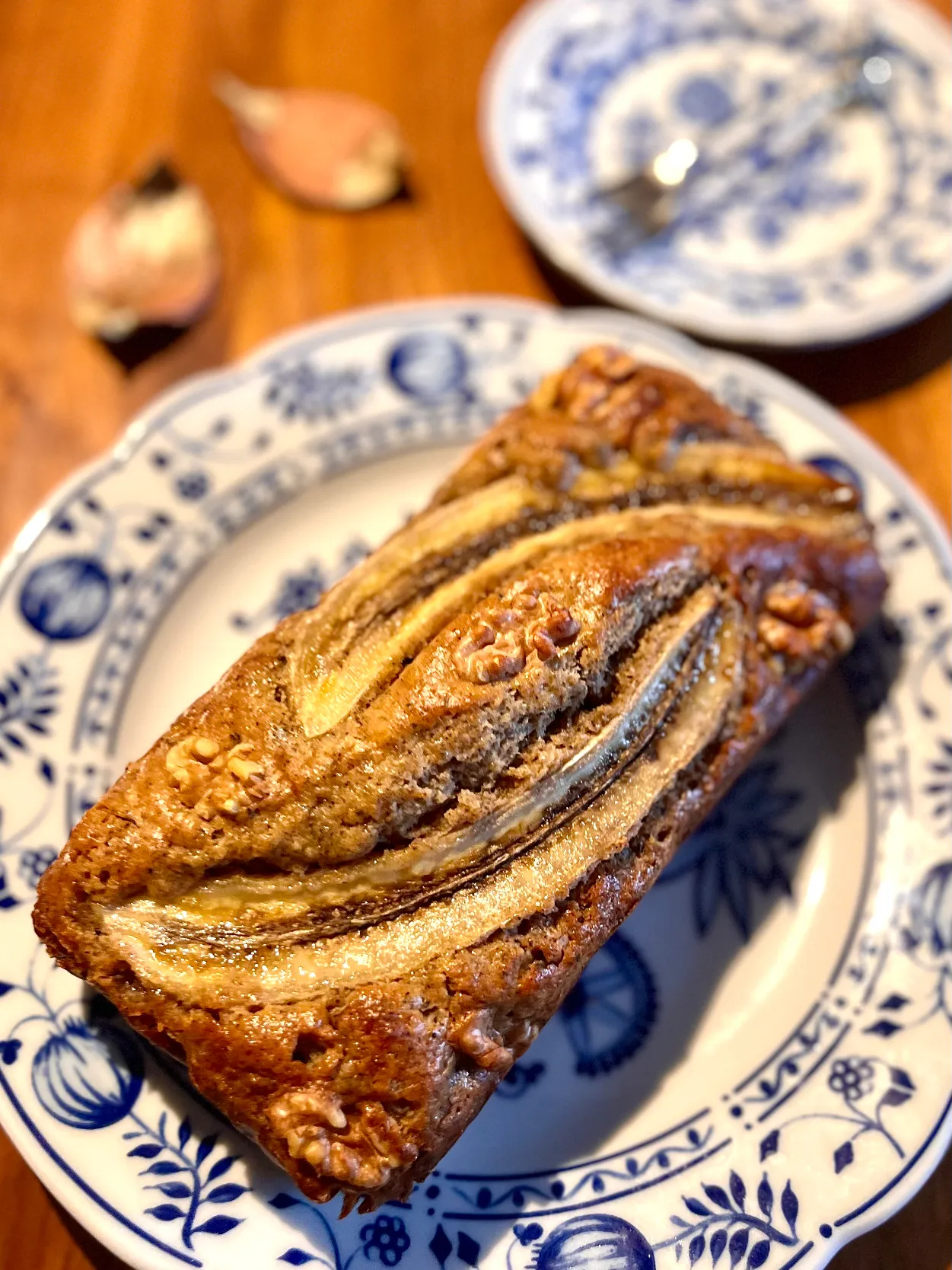 混ぜて焼くだけの簡単ケーキ🍌外はカリッと香ばしく、中はしっとり濃厚に焼き上がりました🫖
