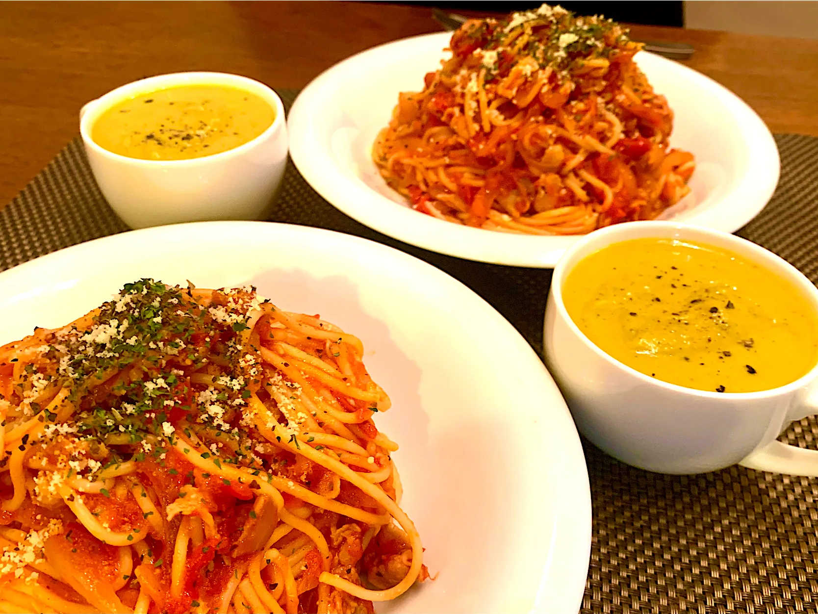 #アマトリチャーナ #パスタ #トマト #豚バラ #にんにく#鷹の爪 #玉ねぎ #ポタージュ #かぼちゃ #牛乳 #コンソメ #記録用