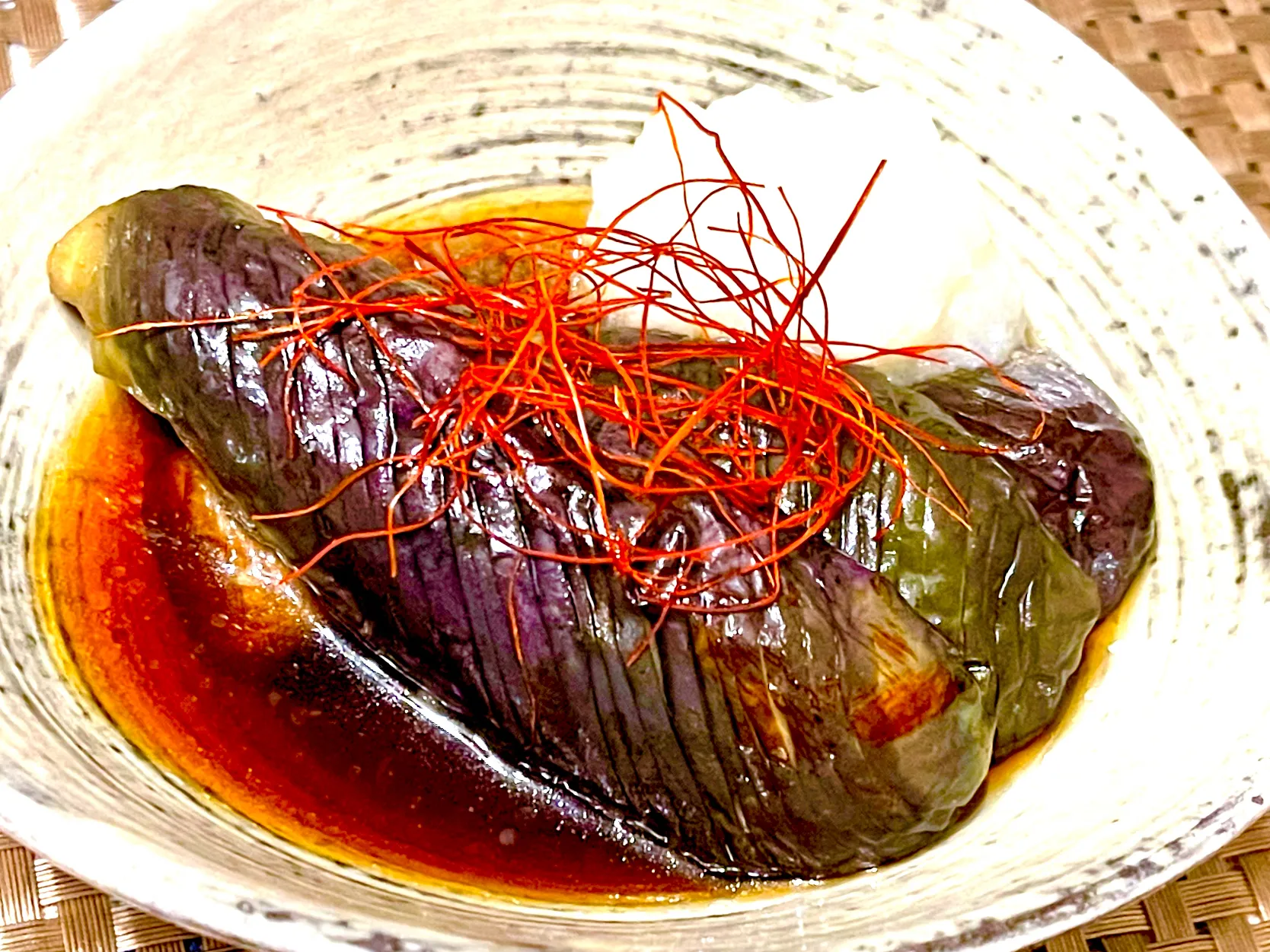 素揚げお茄子をお汁に浸して