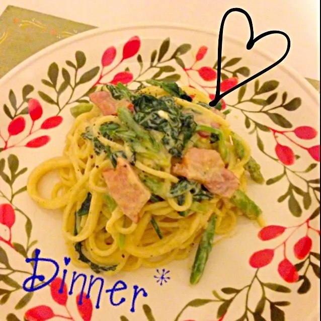 ほうれん草とアスパラの豆乳カルボナーラ★
