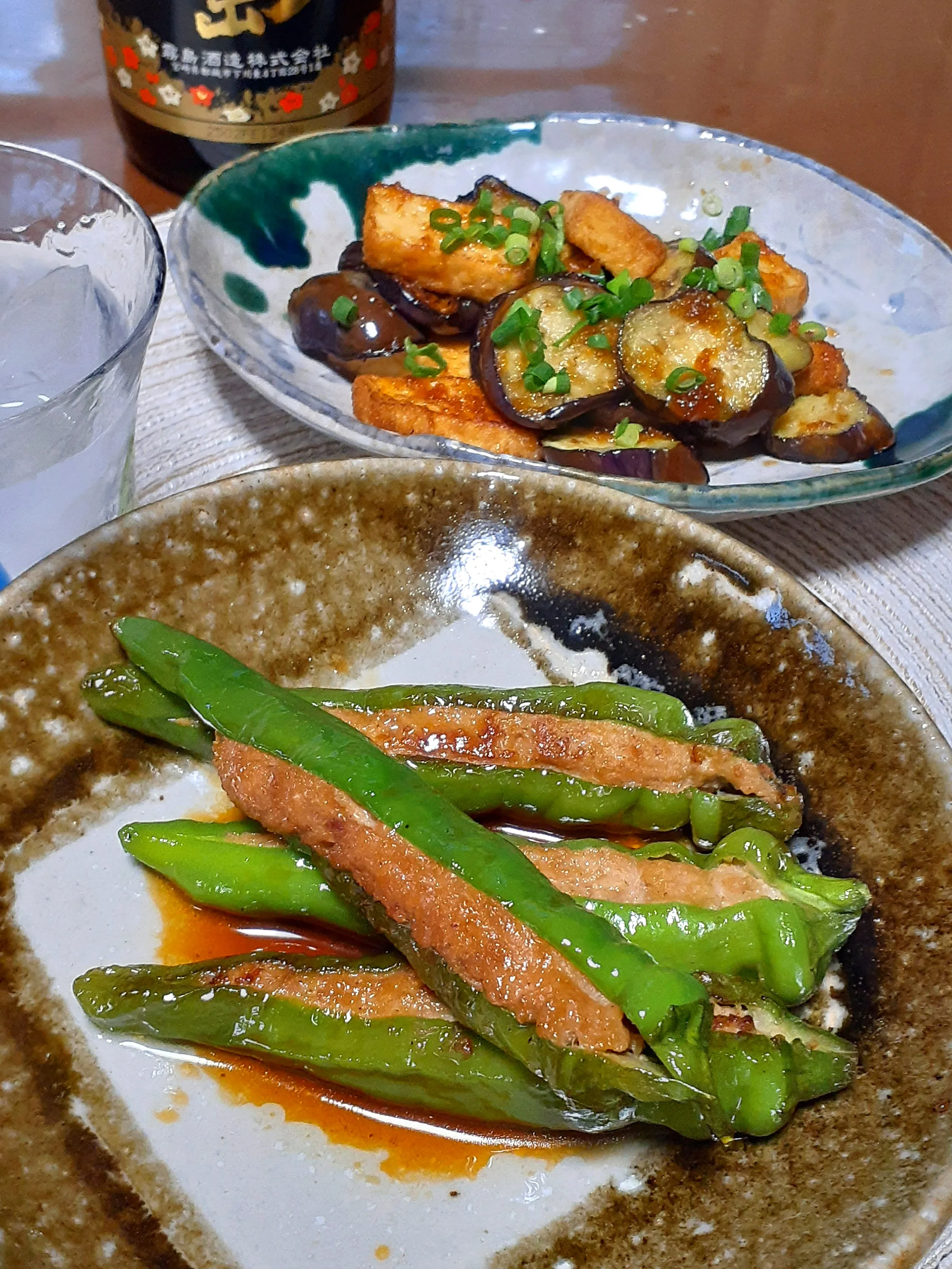 大きな万願寺とうがらし頂いたので肉詰めにして牛だしを絡めました🎵