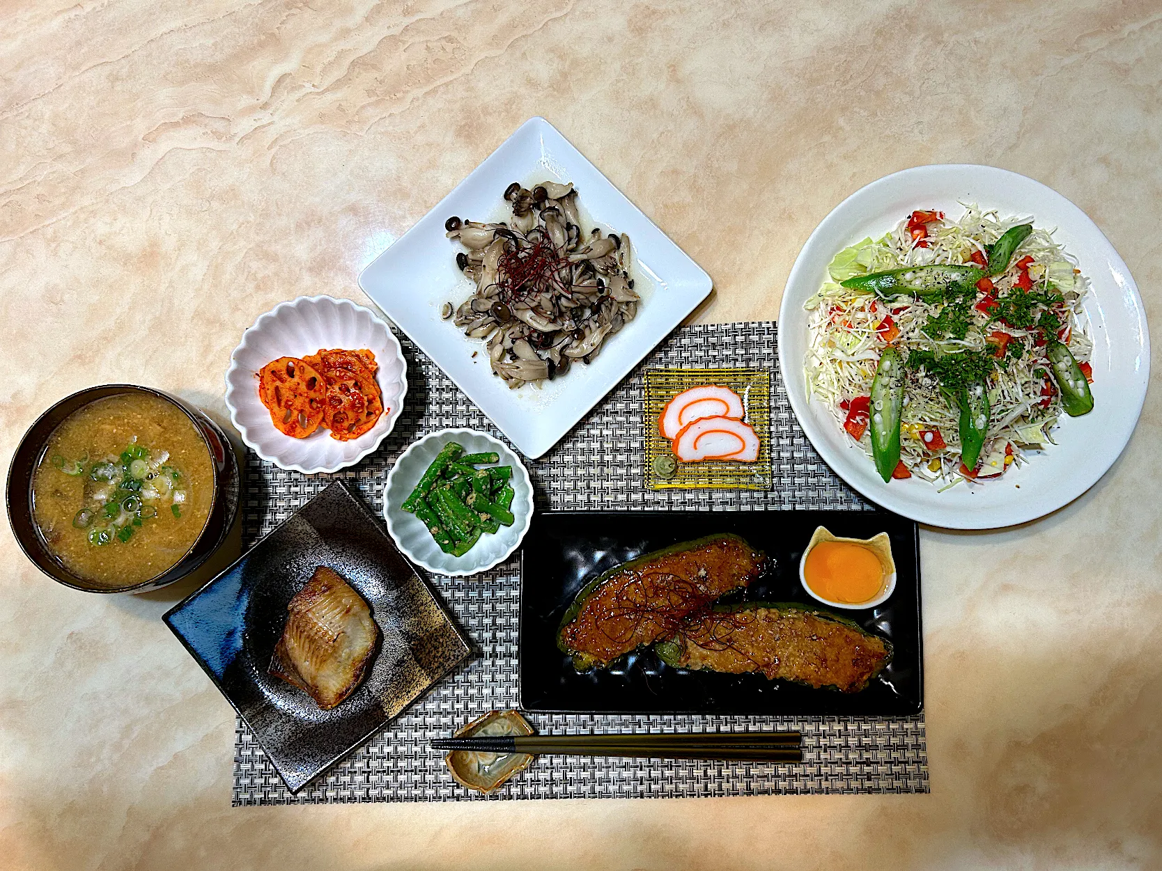 お夕飯 鰹のたたき・カボチャサラダ・厚揚げお好み焼き...