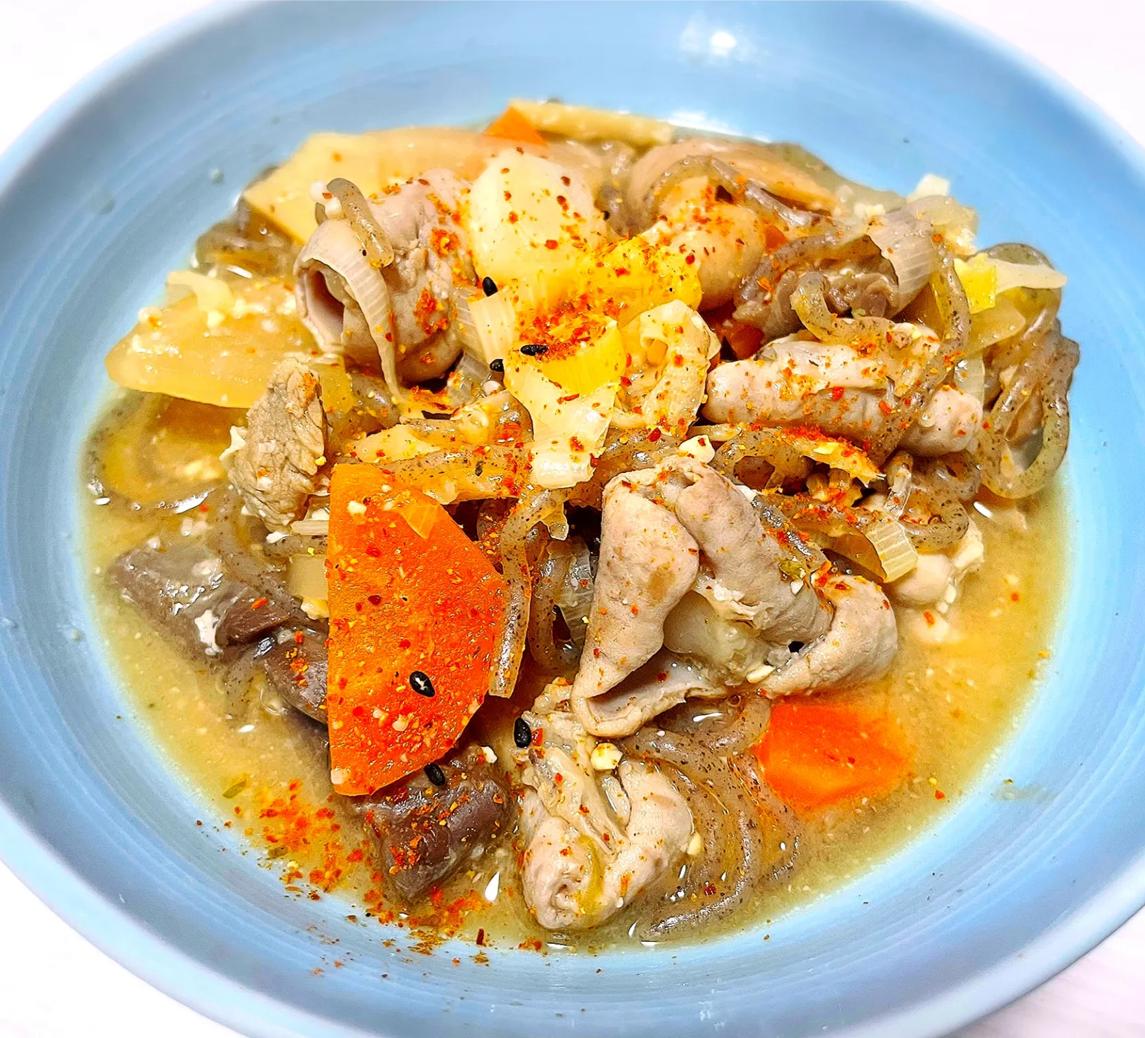 味噌、砂糖、醤油、生姜、にんにく、白だしで煮込んだ。もつの臭みを取るためにネギの青い部分と生姜とお湯で2回煮込んで、意外と手間がかかることを知った。