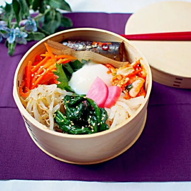 もやし ・ にんじん ・だいこん・ ほうれんの草ナムル キムチ 半熟卵 かぶの酢漬