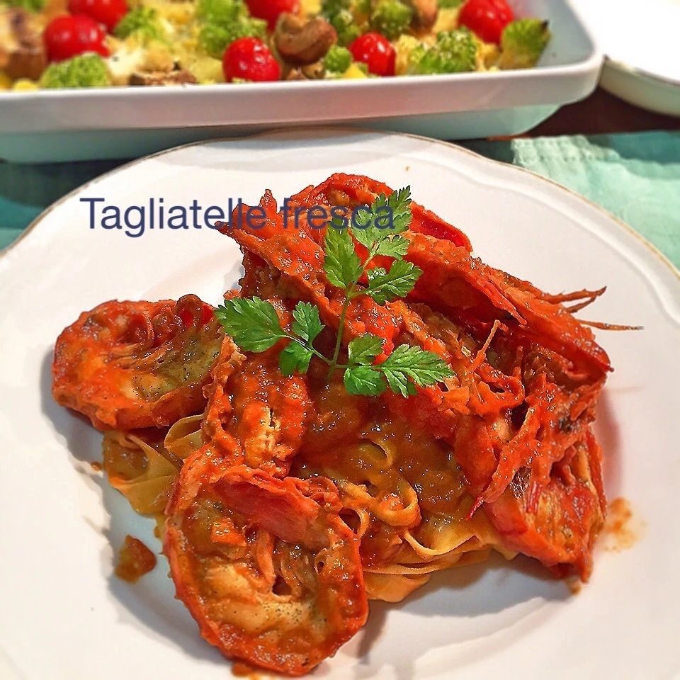 フライパンで両面焼き付けてブランデーを振り入れて、自家製のトマトソースを注いで少し煮てエビの出汁をソースに移す。生クリームを加えて馴染んだら出来上がり〜(^O^)/ #世界の料理 #子供達にも大好評!わがやの自慢の一品ネタ #パスタ