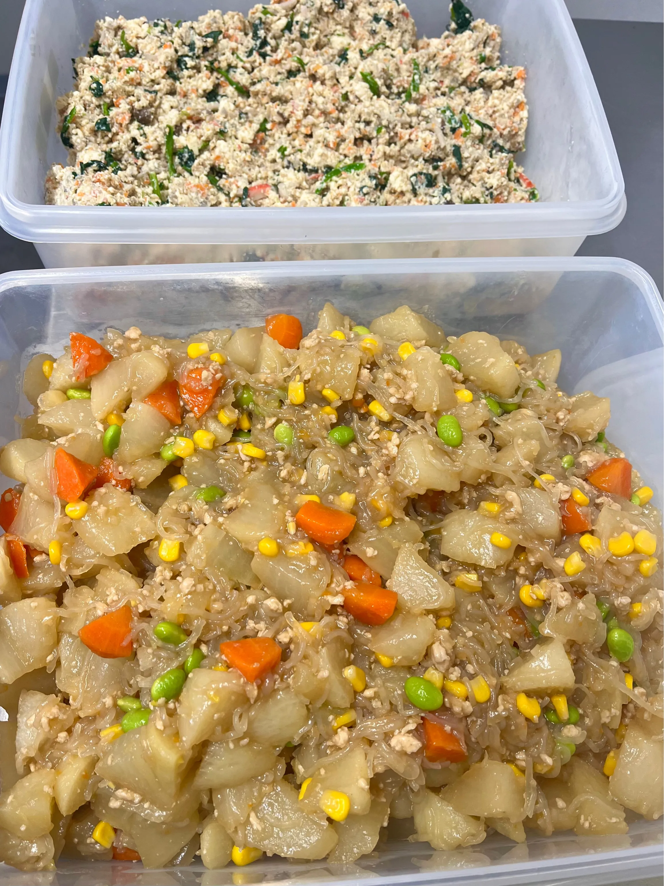 大根、にんじん、糸こんにゃく、鶏ひき肉、しょうが、コーン、枝豆