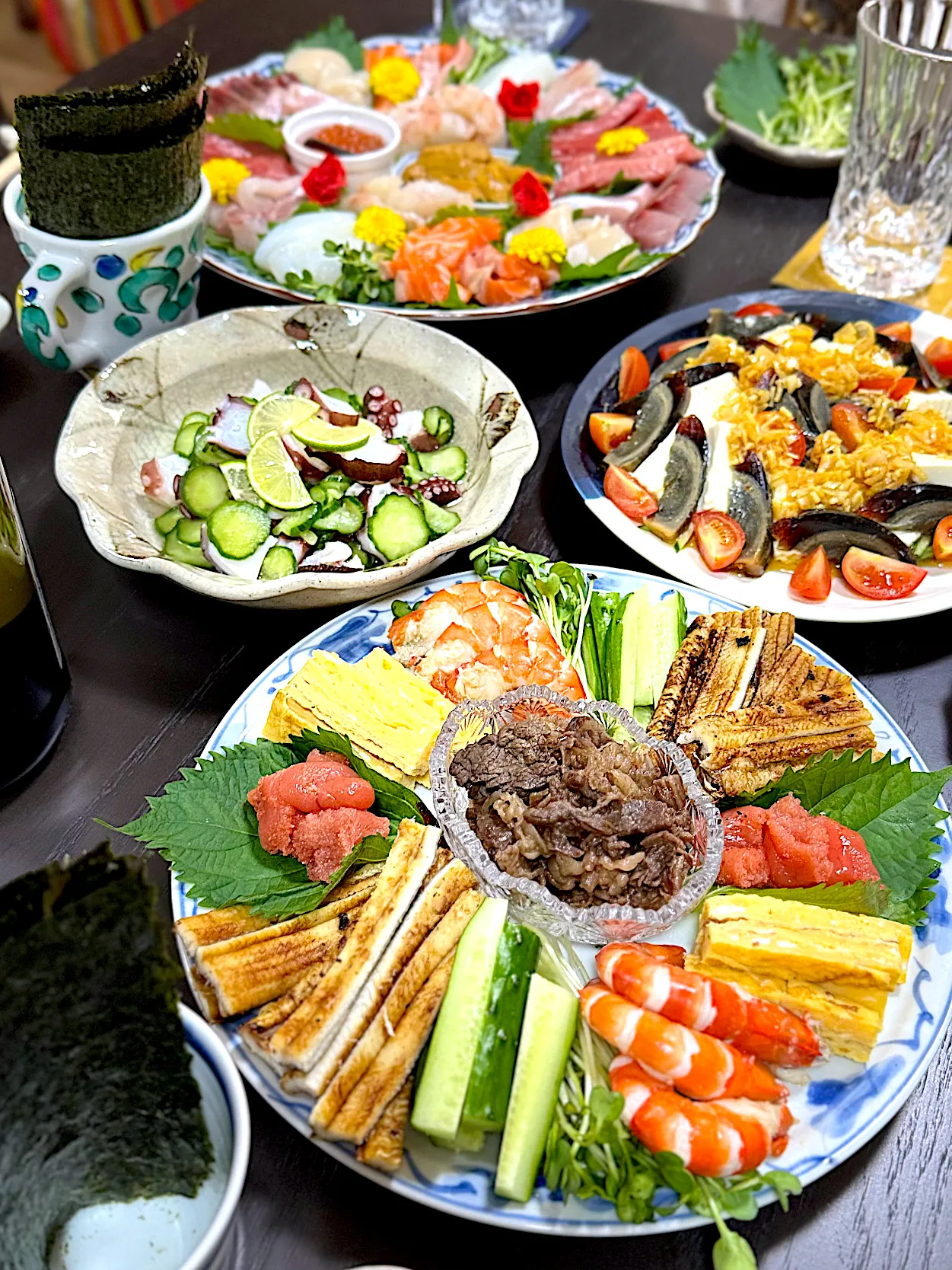 ❆ 寿司ねた(穴子・えび・卵焼き・辛子明太子・牛肉甘辛煮・きゅうり・カイワレ大根・大葉)