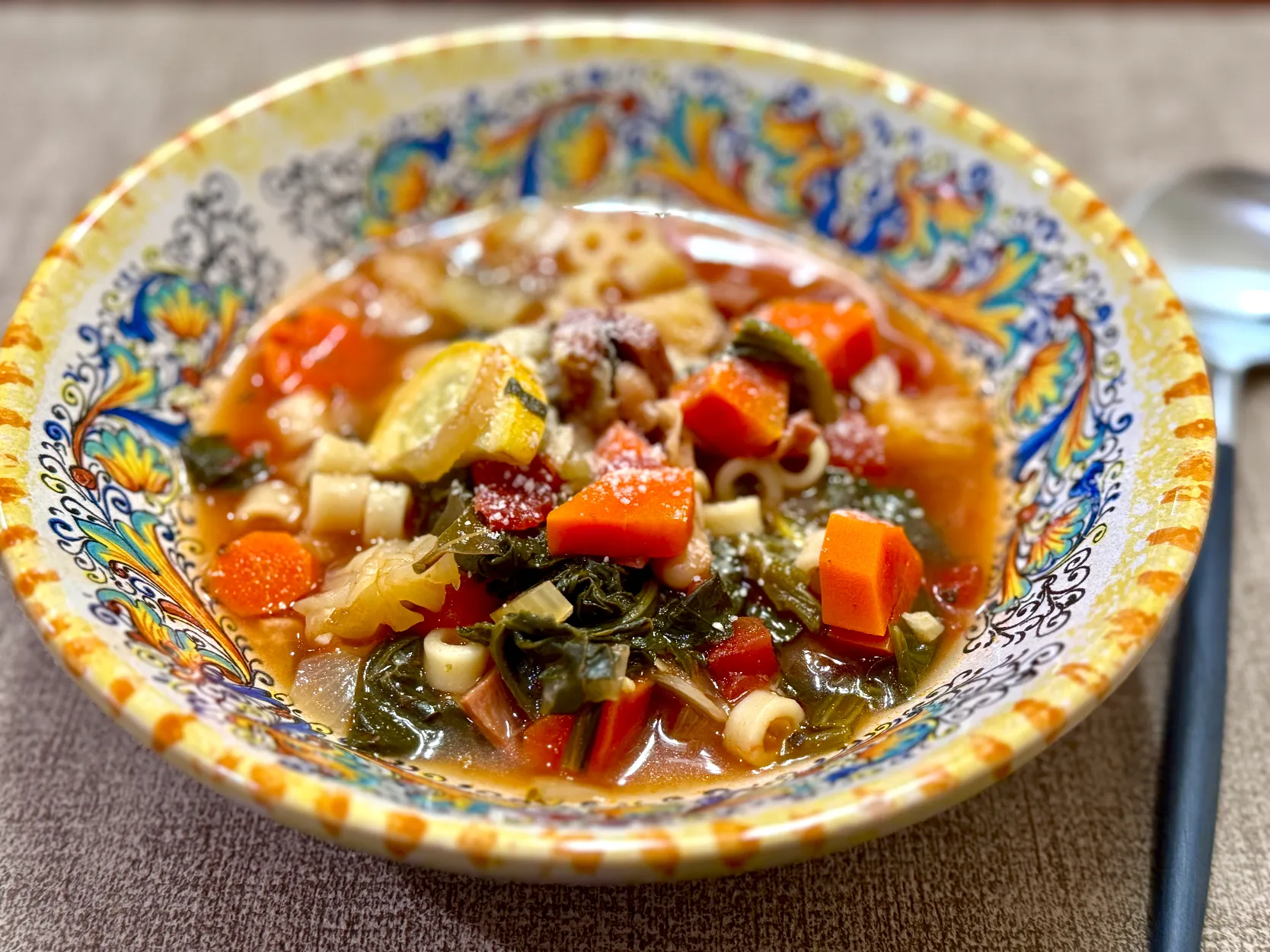 ズッキーニ、イエロースクワッシュ、ネイビービーンズ、玉ねぎ、トマト、セロリ、にんじん、キャベツ、ほうれん草、ニンニク、イタリアンパセリ、オレガノ、ショートパスタ