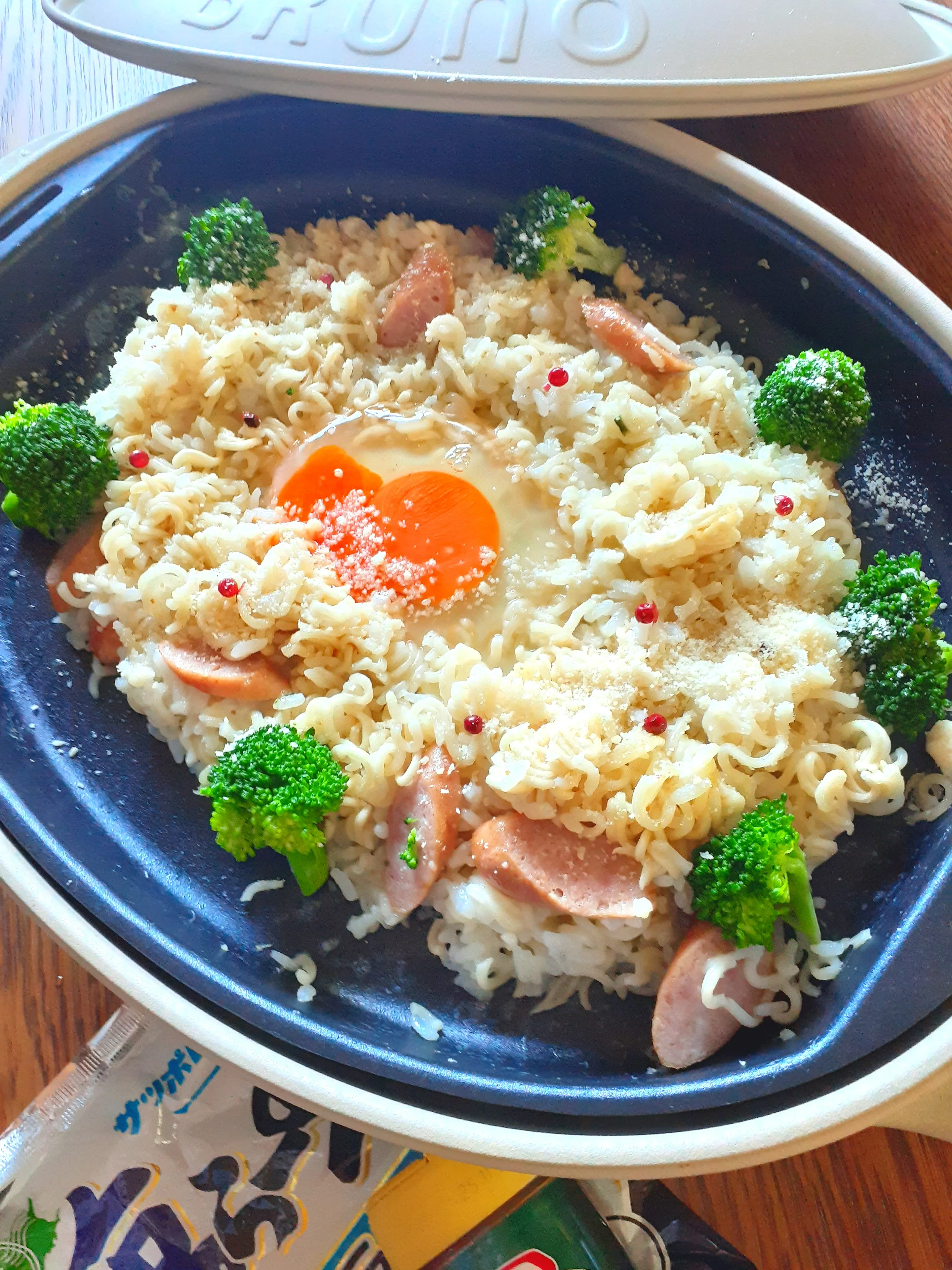 インスタントラーメンとごはん🍚でカルボナーラ👍