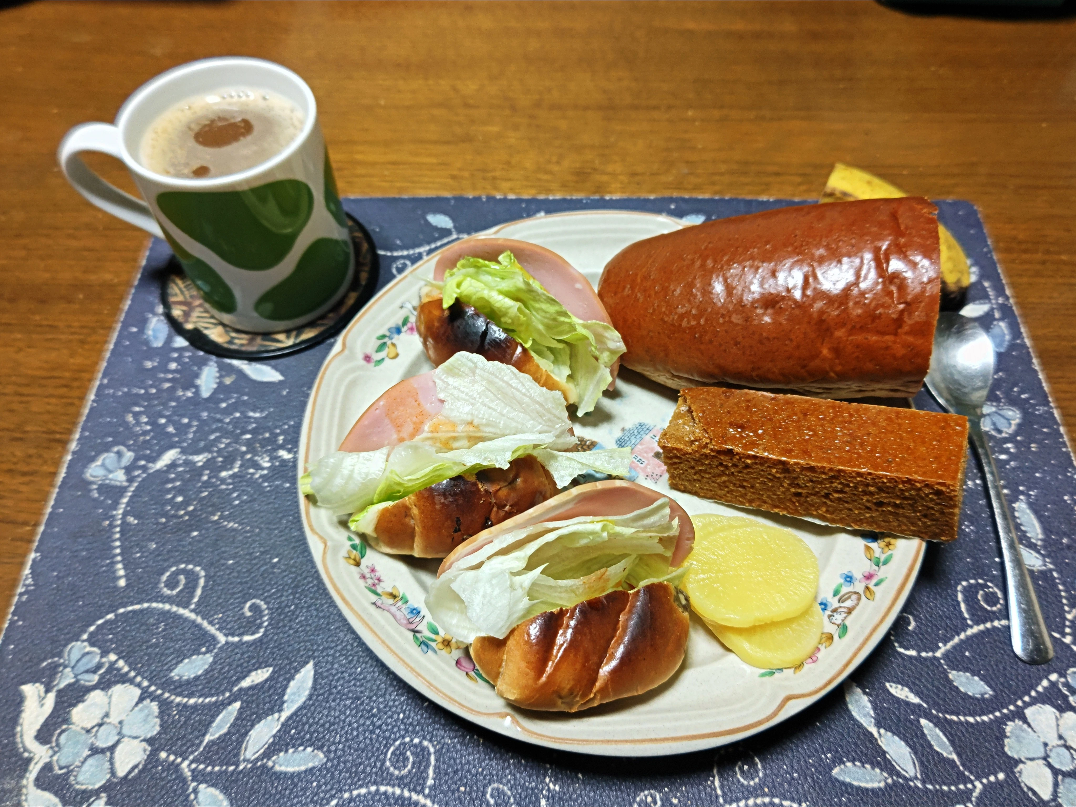 ・レーズンロールパントーストサンドイッチ:レーズンロールパンに切れ目を入れて、練った調味料(マーガリン,マヨネーズ,ねりからし)を塗り,モッツァレラスライスチーズを挟み焼き,レタス&ロースハム&オリーブオイル&辛味香辛料